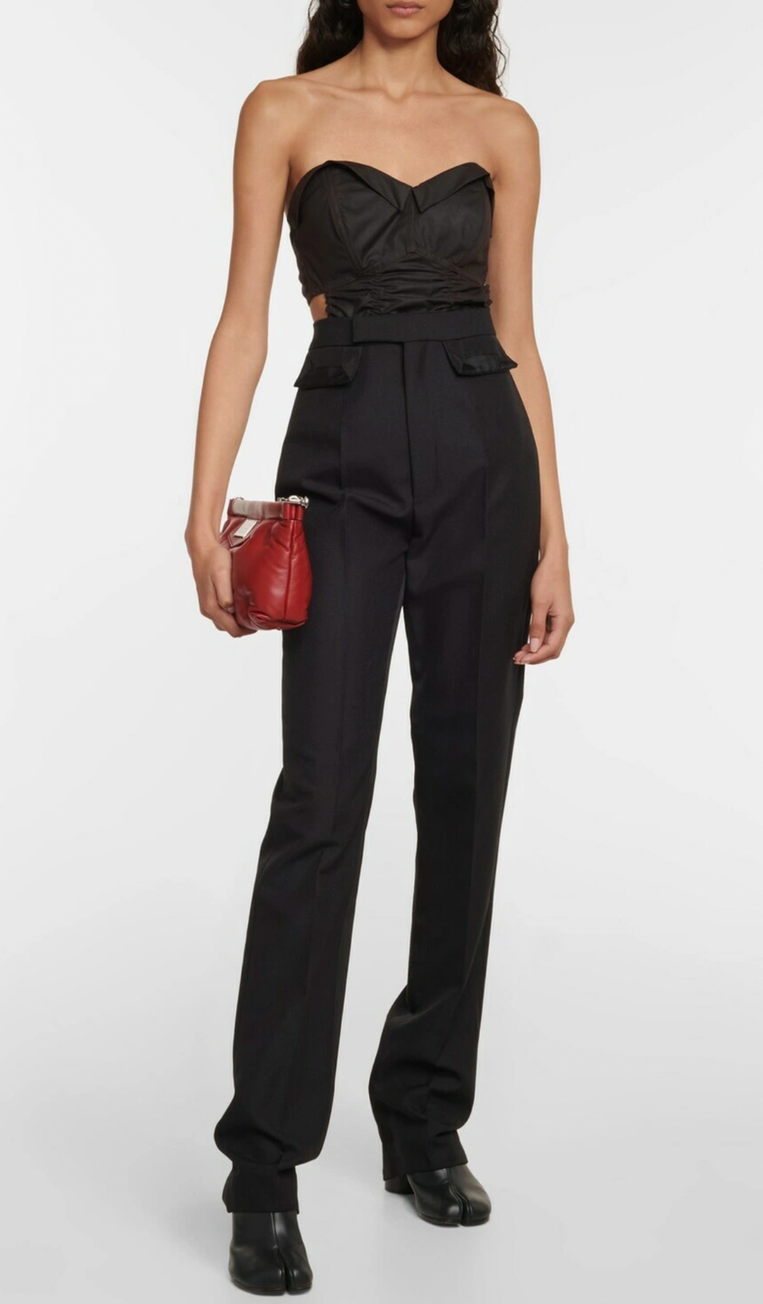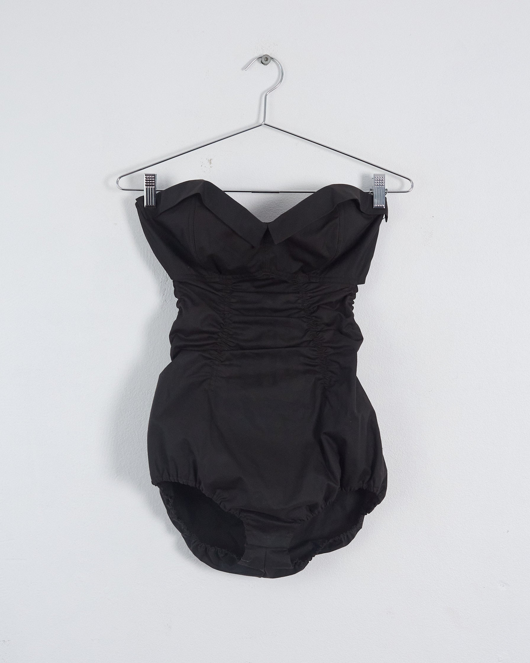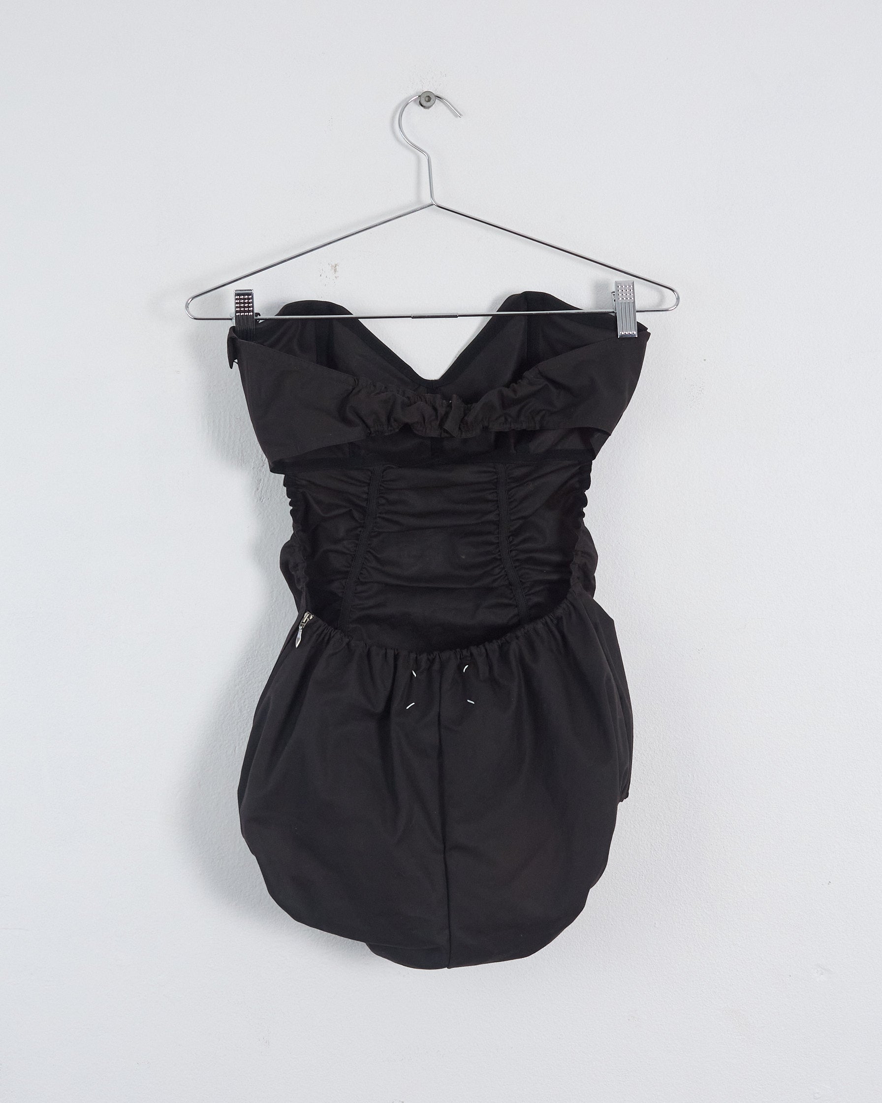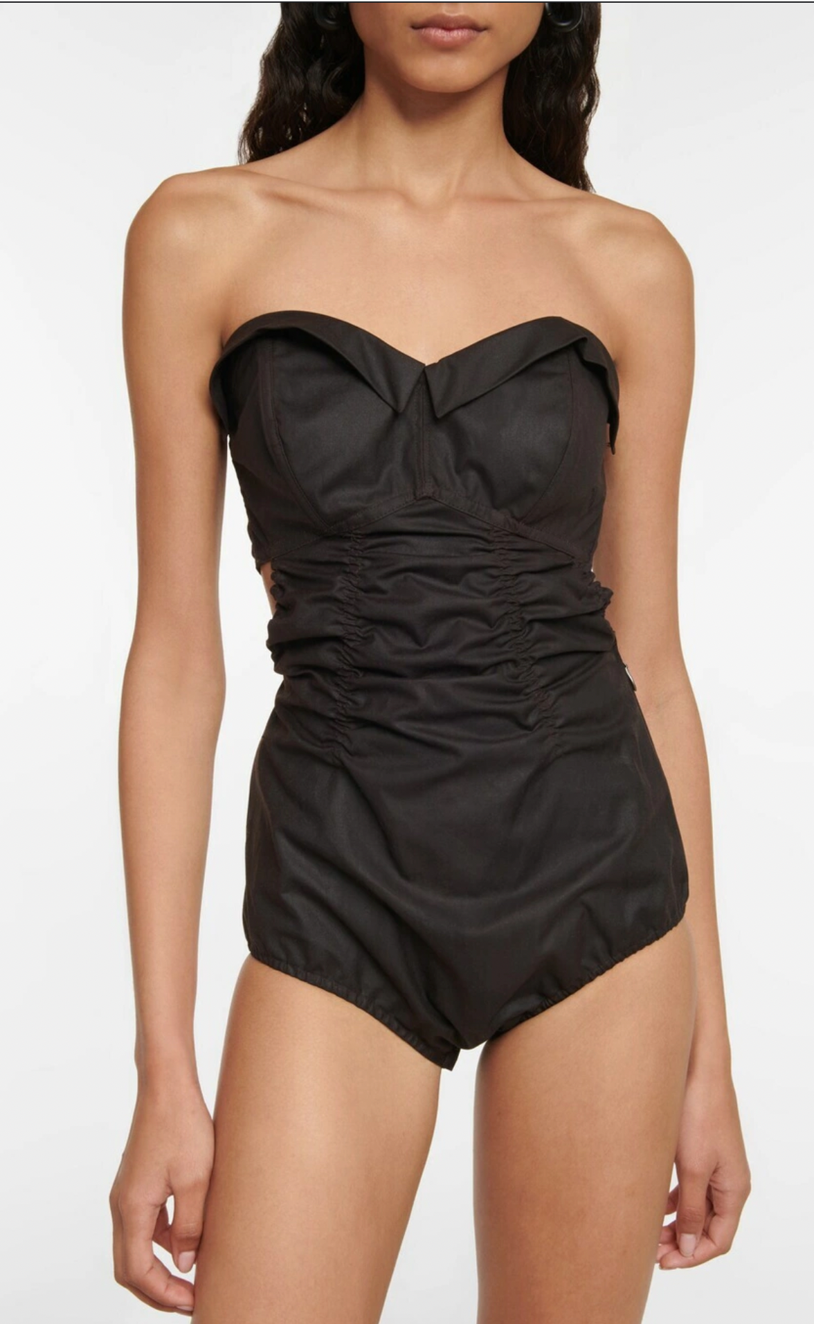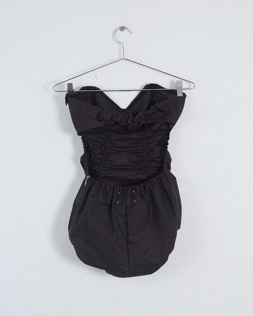 This bodysuit from the Fall 2022 collection by Maison Margiela is made from waxed cotton in a ruched design with a sweetheart neckline. The house's signature four white stitches are featured below the cut-out back. Details include a side zip closure, and hook and eye bra fastenings at the back.