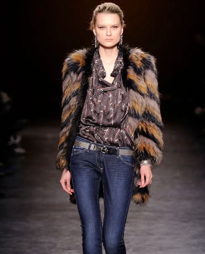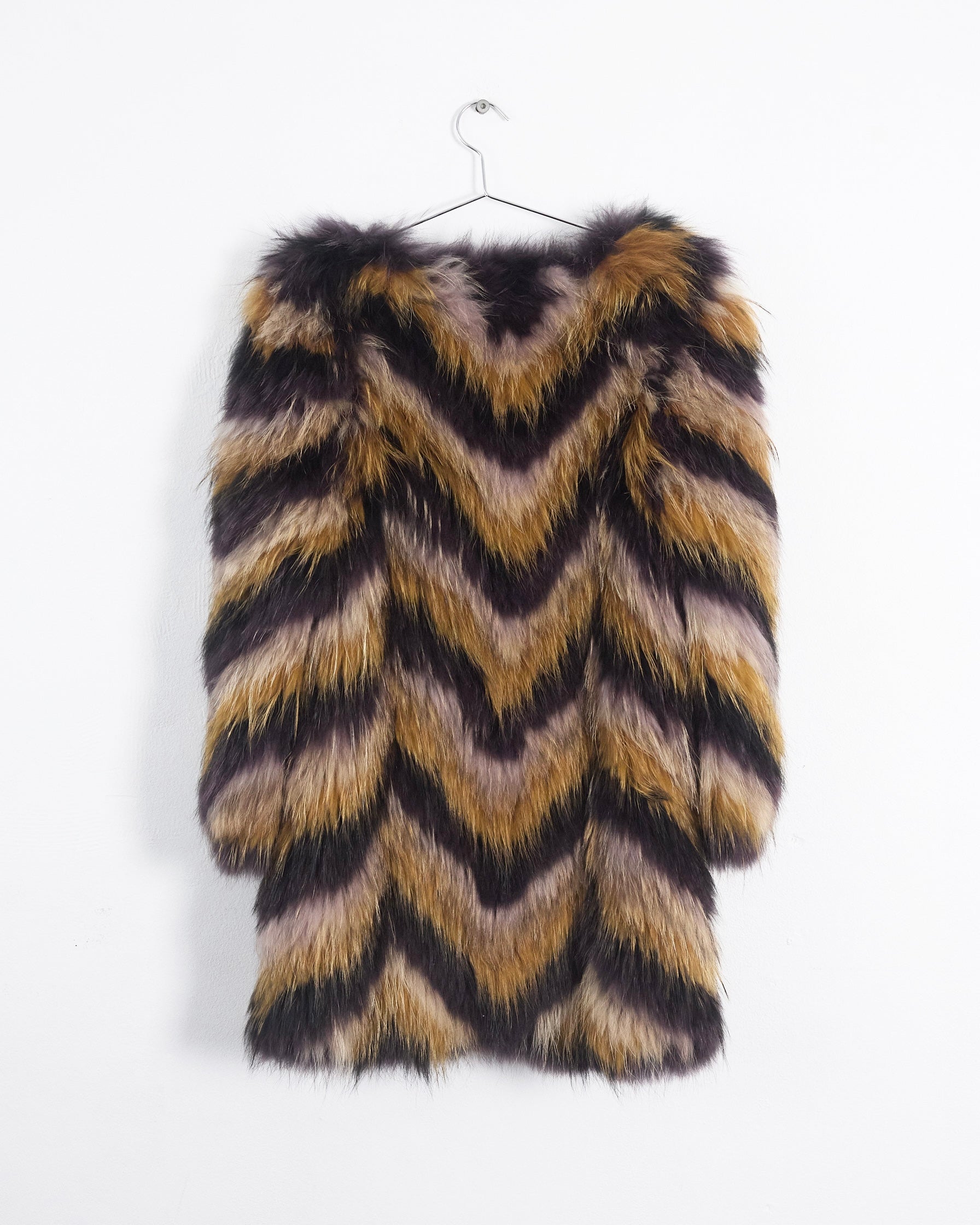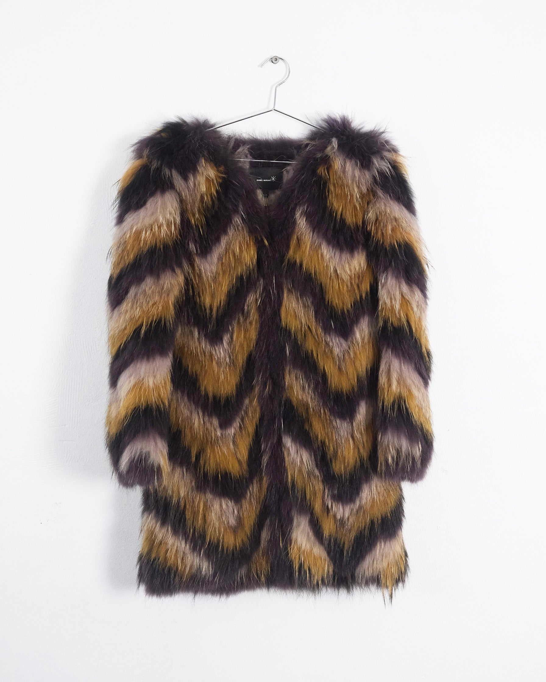 This Isabel Marant Fall 2010 runway coat showcases luxurious raccoon fur in a striking chevron pattern across plum, mustard, and beige tones, edged with lambskin leather. Featuring a round neckline, long sleeves, and mid-thigh length silhouette, the piece combines elegance with practicality through concealed hook-and-eye fastenings and functional side pockets.