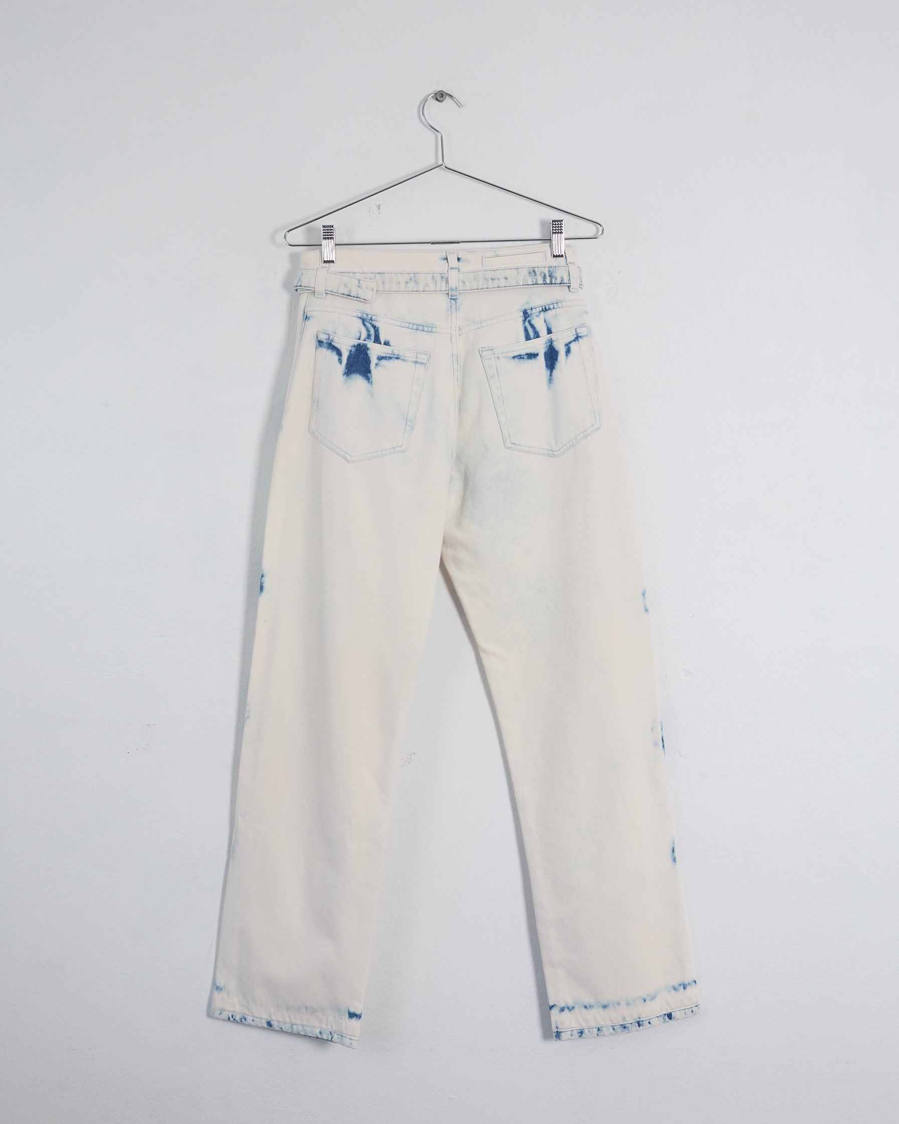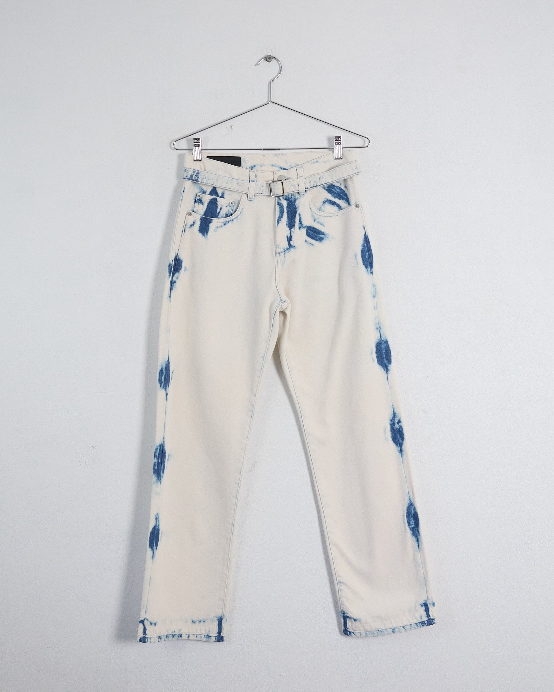 From Proenza Schouler's Spring 2024 collection, these 'ellsworth' jeans present a striking bleached tie-dye treatment across premium denim. The silhouette combines an easygoing boyfriend fit with a streamlined straight leg. These jeans feature a monogram-embossed button closure and a coordinating denim belt. Details include a classic five pockets design and belt loops.