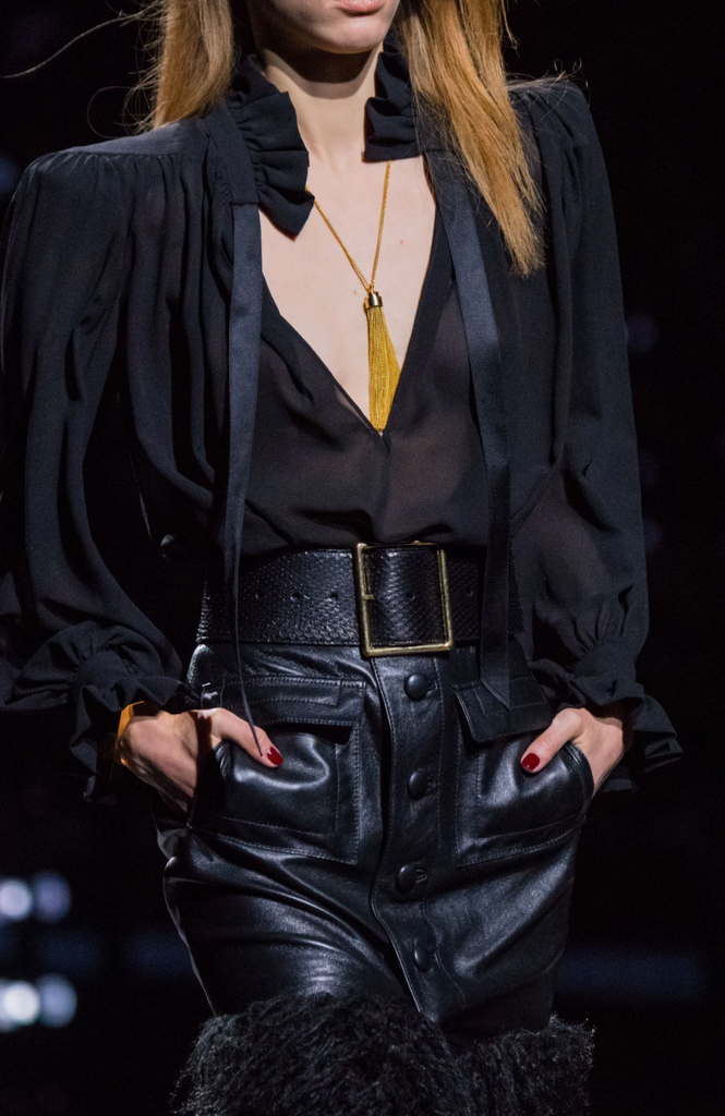 This black blouse, designed by Anthony Vacarello, debuted on the Fall 2019 runway at Saint Laurent. Crafted from luxurious silk georgette, it features an open v-neckline with ruffle trim, a silk ribbon tie and shoulder pads. The long sleeves are punctuated with button cuffs with ruffle trims.