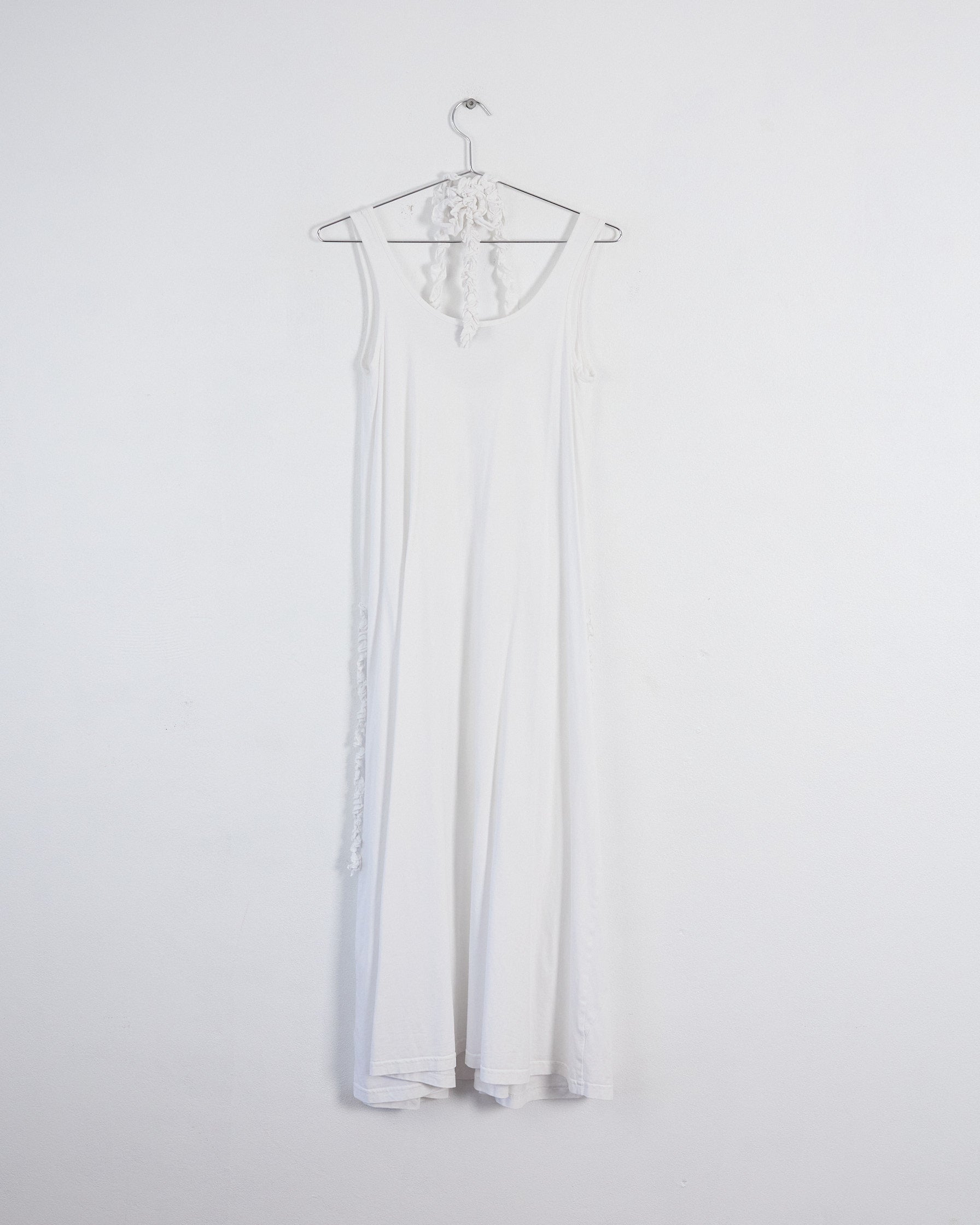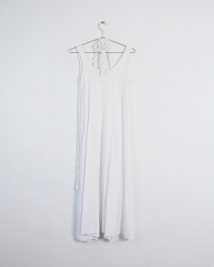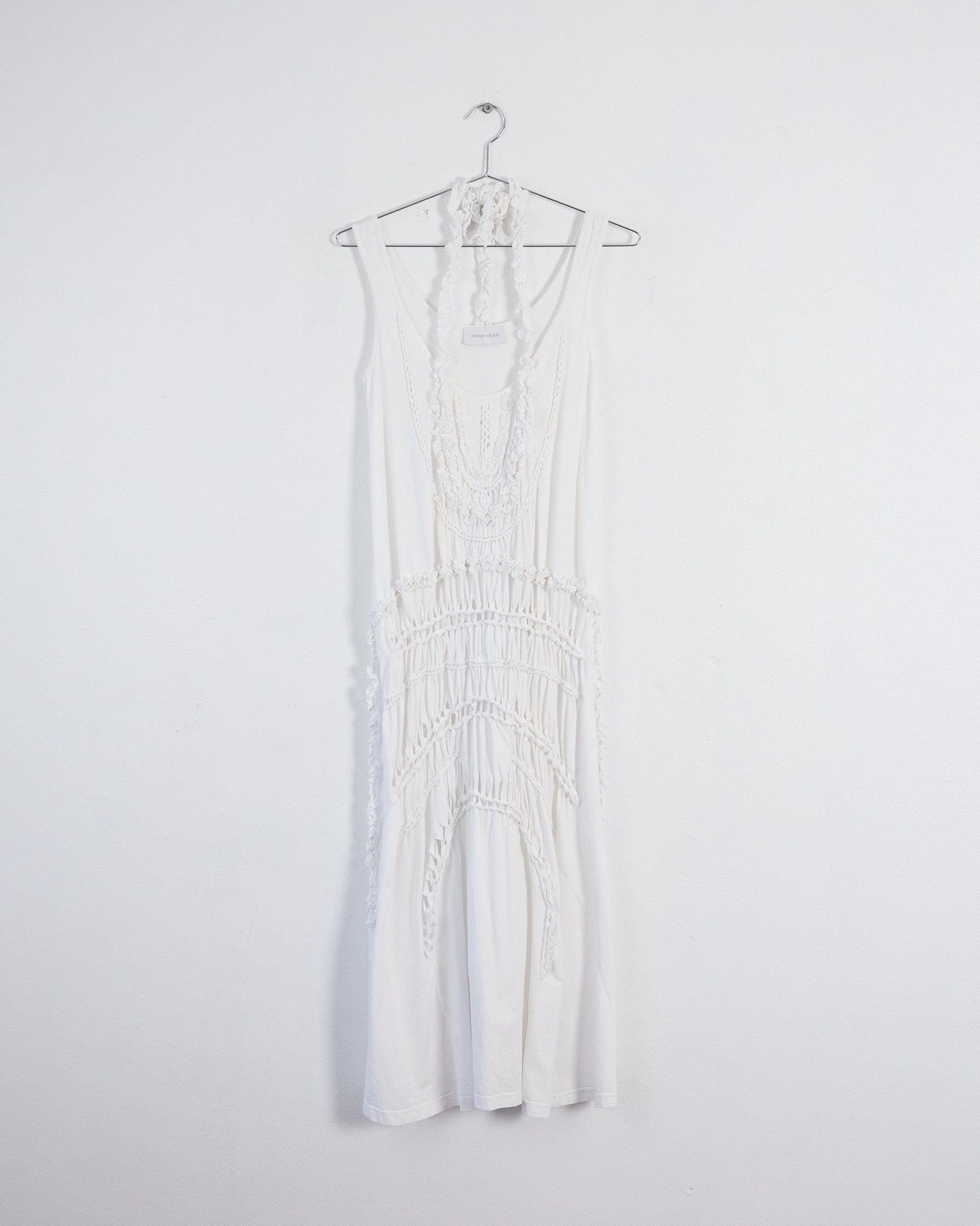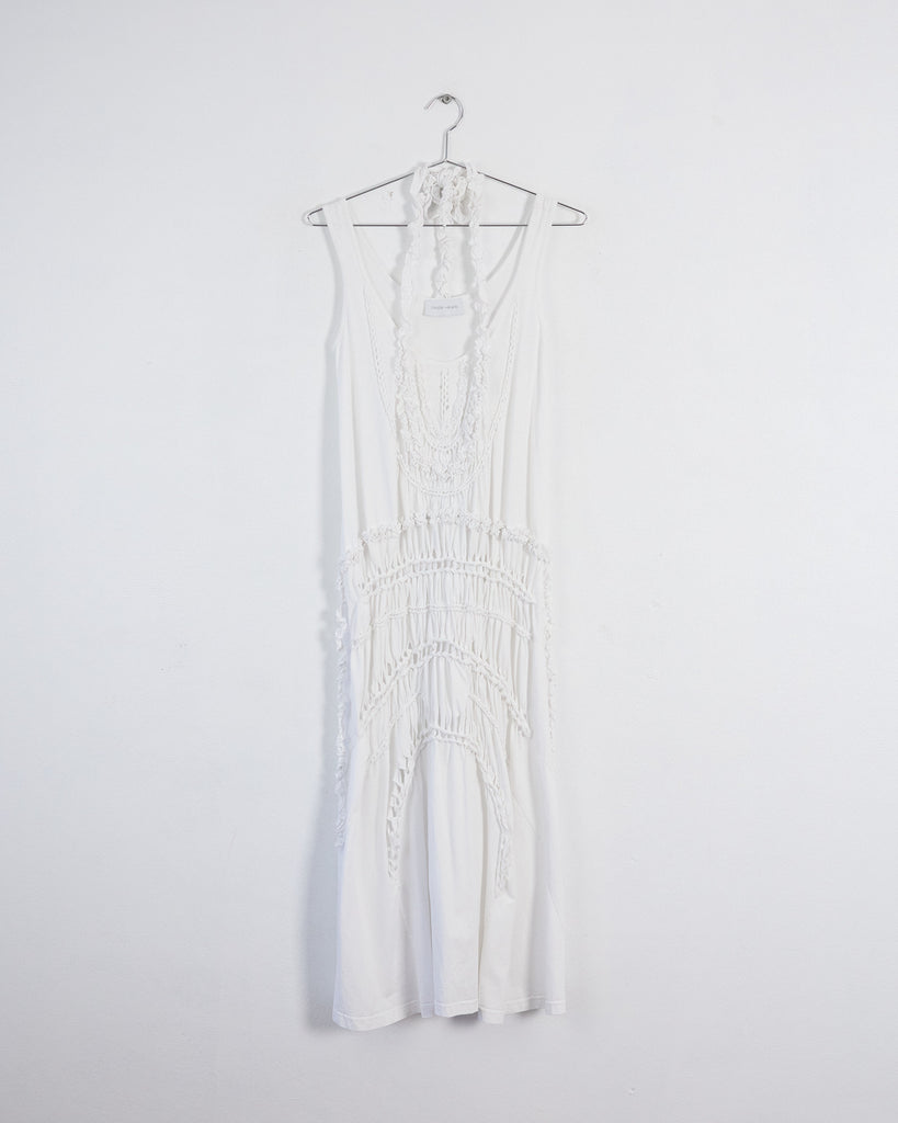 Debuting on the Spring 2023 runway, this white cotton jersey dress by Christian Wijnants features a scoop neckline, halter tie accents, and a sleeveless design. Summer-ready, this midi-length piece showcases a handcrafted macramé texture, exemplifying artisanal craftsmanship.