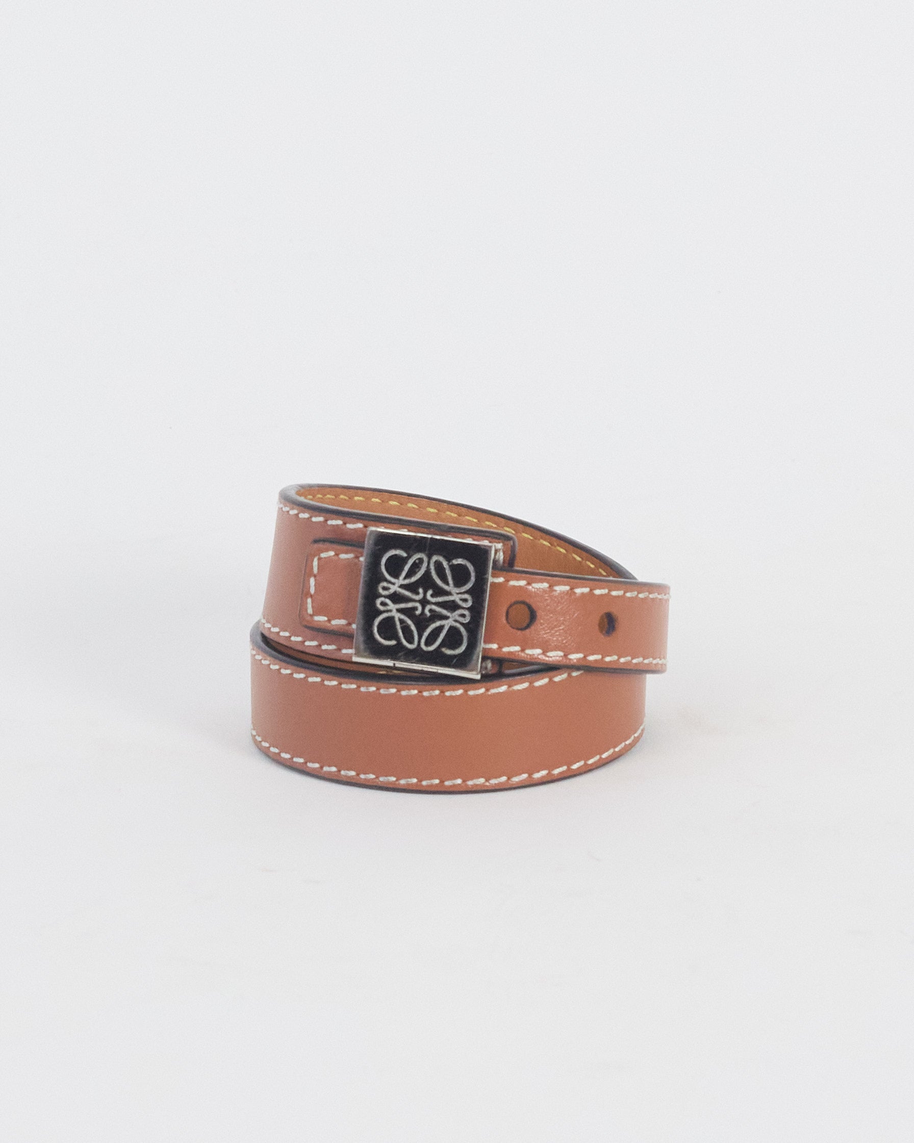 Designed during Jonathan Anderson's tenure at Loewe, this bracelet is crafted from luxurious tan leather, edged with contrast white saddle stitching. It wraps twice, made adjustable with a hole/post fastening and closes with a polished silver-tone metal clasp, engraved with the brand's iconic 'anagram' logo.