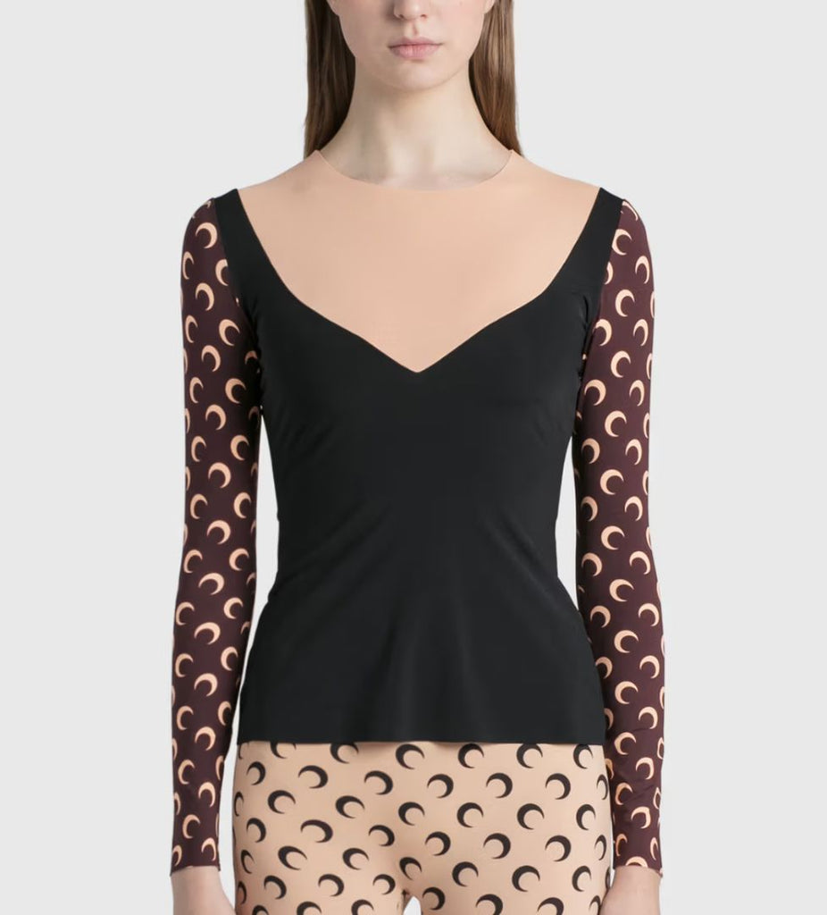This Marine Serre top features a faux sweetheart neckline that creates a trompe l’oeil effect. Designed for a slim, second-skin fit, it has a crew neck and long sleeves. The sleeves are detailed with crescent moon print panels, crafted from a technical fabric that offers both stretch and a luxuriously soft feel.