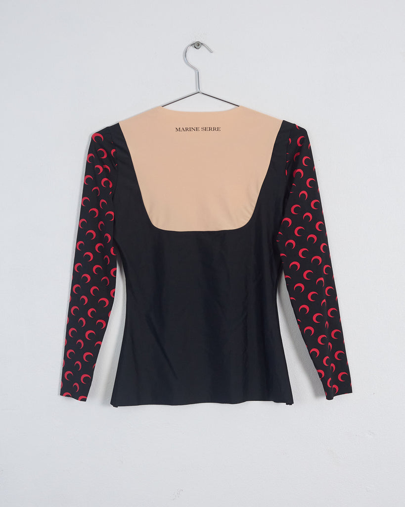 Marine Serre trompe l'oeil v-neck 'second skin' moon print top, black, red & nude, 12