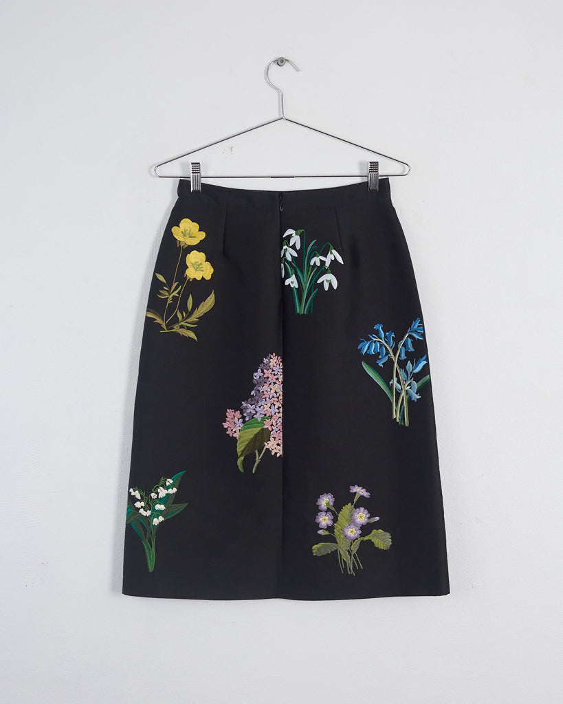 This Stella McCartney skirt, introduced in the Resort 2019 collection, draws inspiration from English country gardens. It showcases a black base with an a-line midi silhouette, adorned with finely embroidered wildflowers. Details include a fixed waistband and a concealed back zip closure with hook-and-eye fastening.