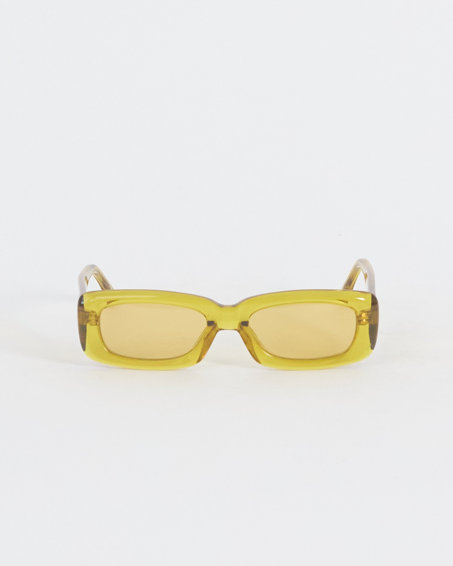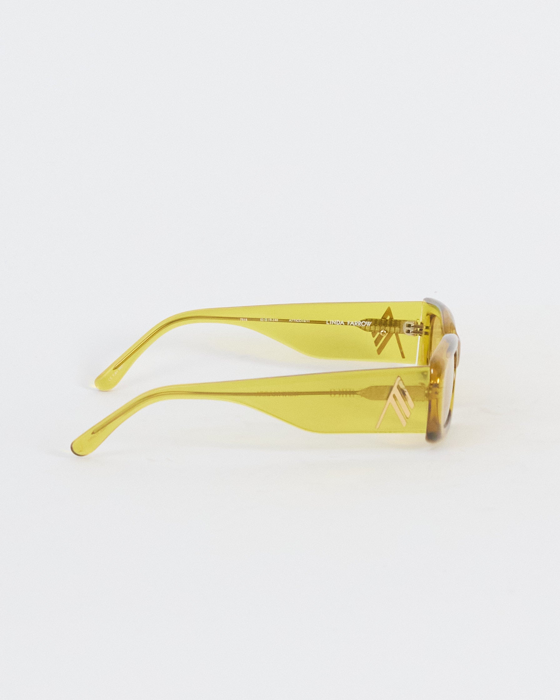 These standout yellow 'mini marfa' sunglasses hail from the Linda Farrow collaboration with The Attico. These slim rectangular sunglasses are realised in a mustard yellow acetate, beveled and highly polished for a luxurious soft edge finish. Wide temples are detailed with gold branding and tonal yellow lenses offer 100% UV protection. Sculpted nose pads and temple tips provide comfort to the wearer.