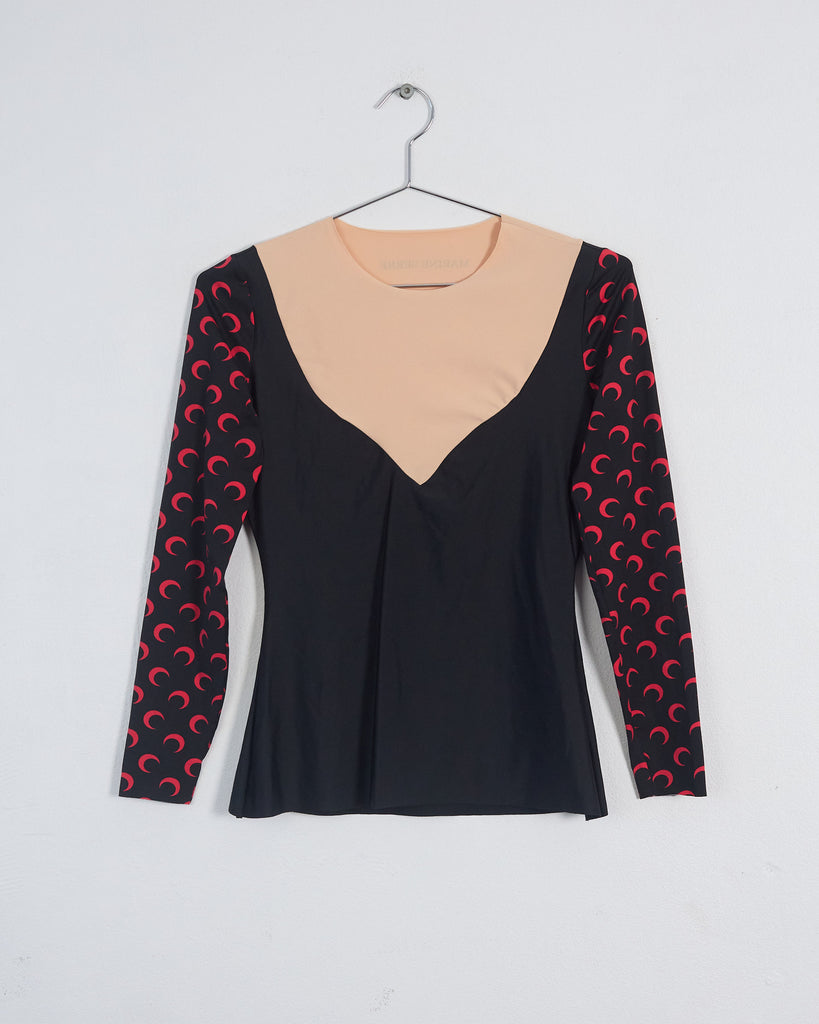 Marine Serre trompe l'oeil v-neck 'second skin' moon print top, black, red & nude, 12