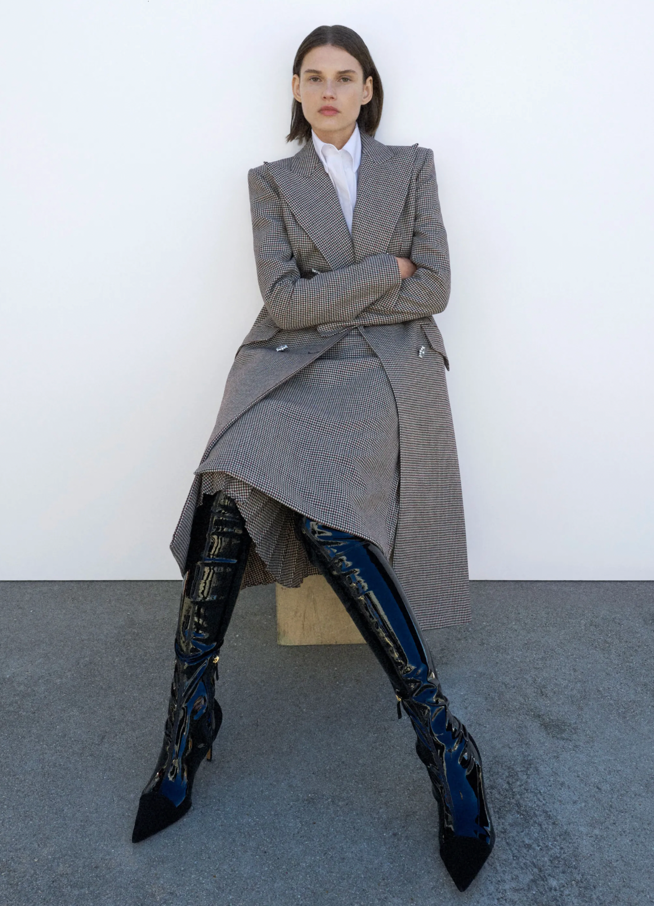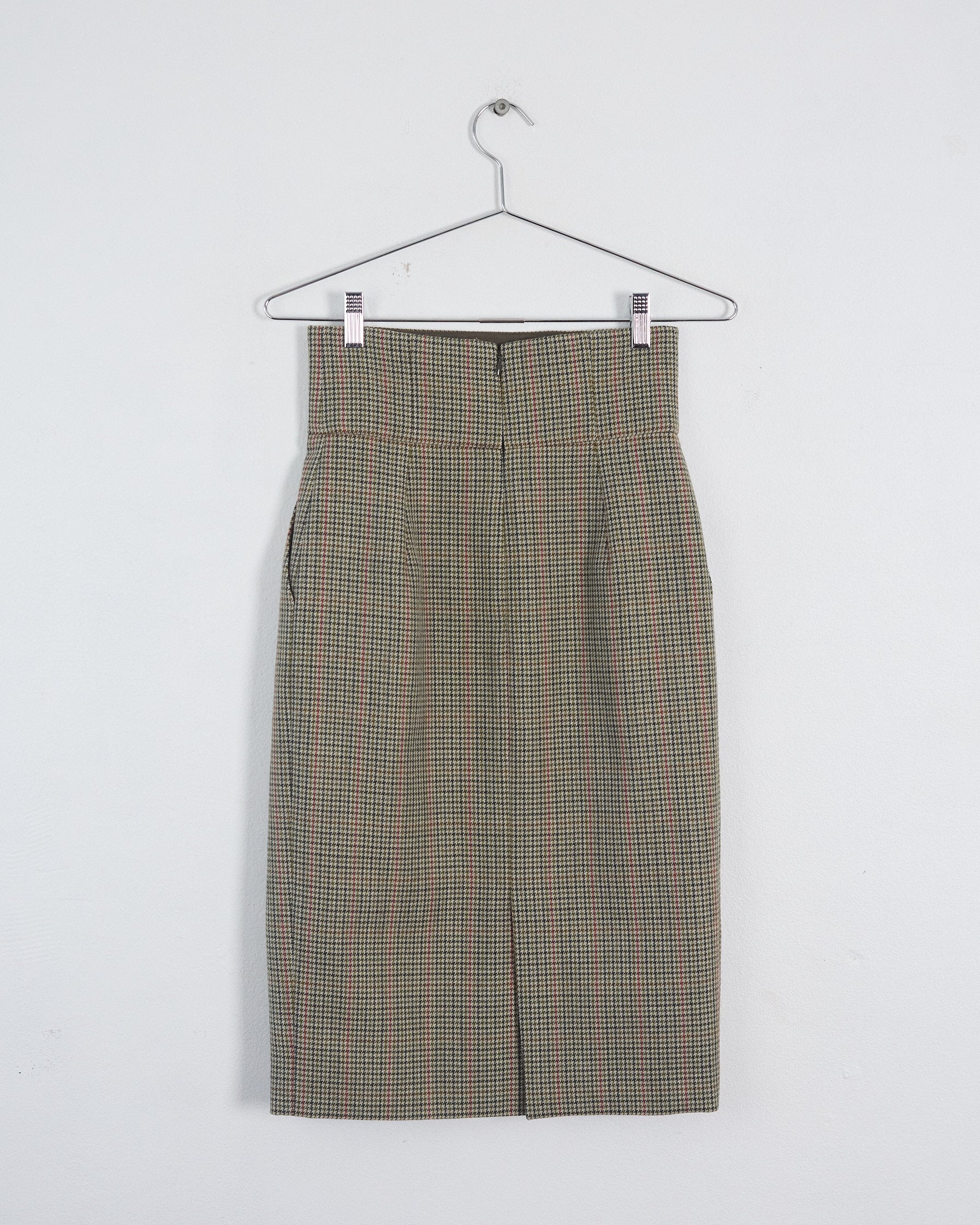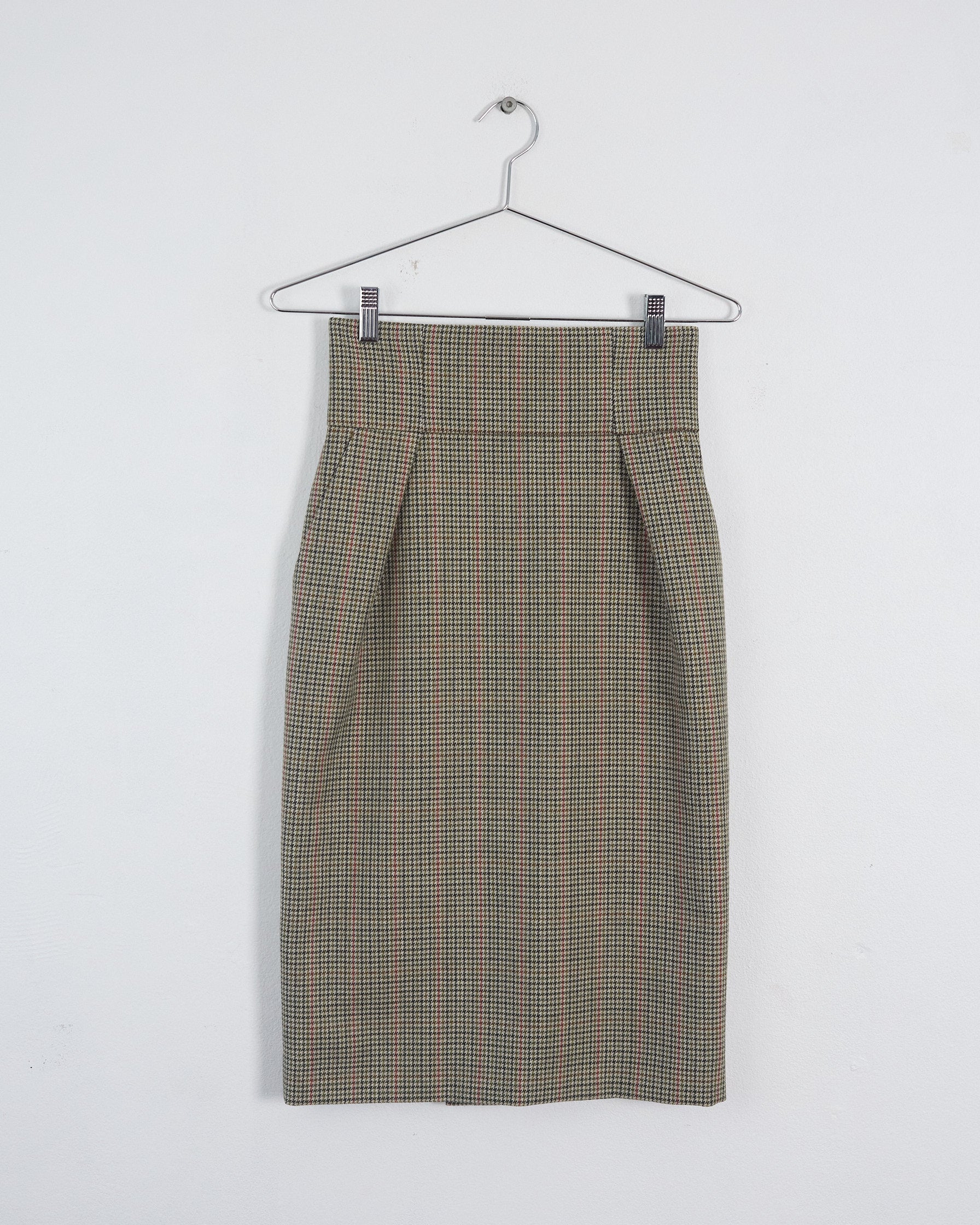 This tailored pencil skirt from Alexandre Vauthier showcases a sophisticated Prince of Wales check pattern in rich brown and multi tones. Crafted from premium wool, it features pleated trims and practical side slant pockets. The skirt fastens securely with a concealed back zip closure with hook and eye fastening, while a full lining ensures comfort and a polished silhouette. A subtle back vent allows ease of movement.