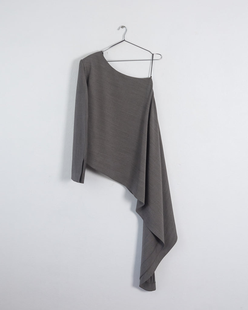 A striking piece from the Phoebe Philo collection B, this grey tailored top showcases architectural design through its asymmetric silhouette. Constructed from a refined wool and mohair blend, it features a strong shoulder punctuated by a single extended sleeve with a split cuff detail and a dramatic draped panel that defines one side. Secured with a concealed side zip and hook-and-eye closure, this sophisticated top exemplifies contemporary tailoring with understated elegance.