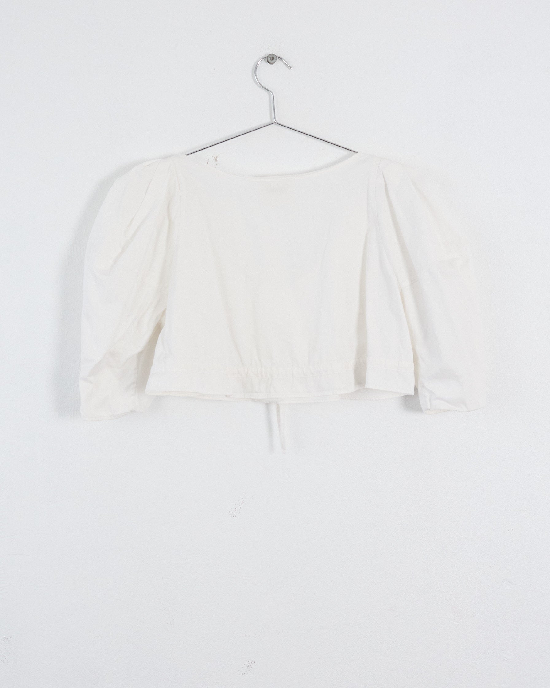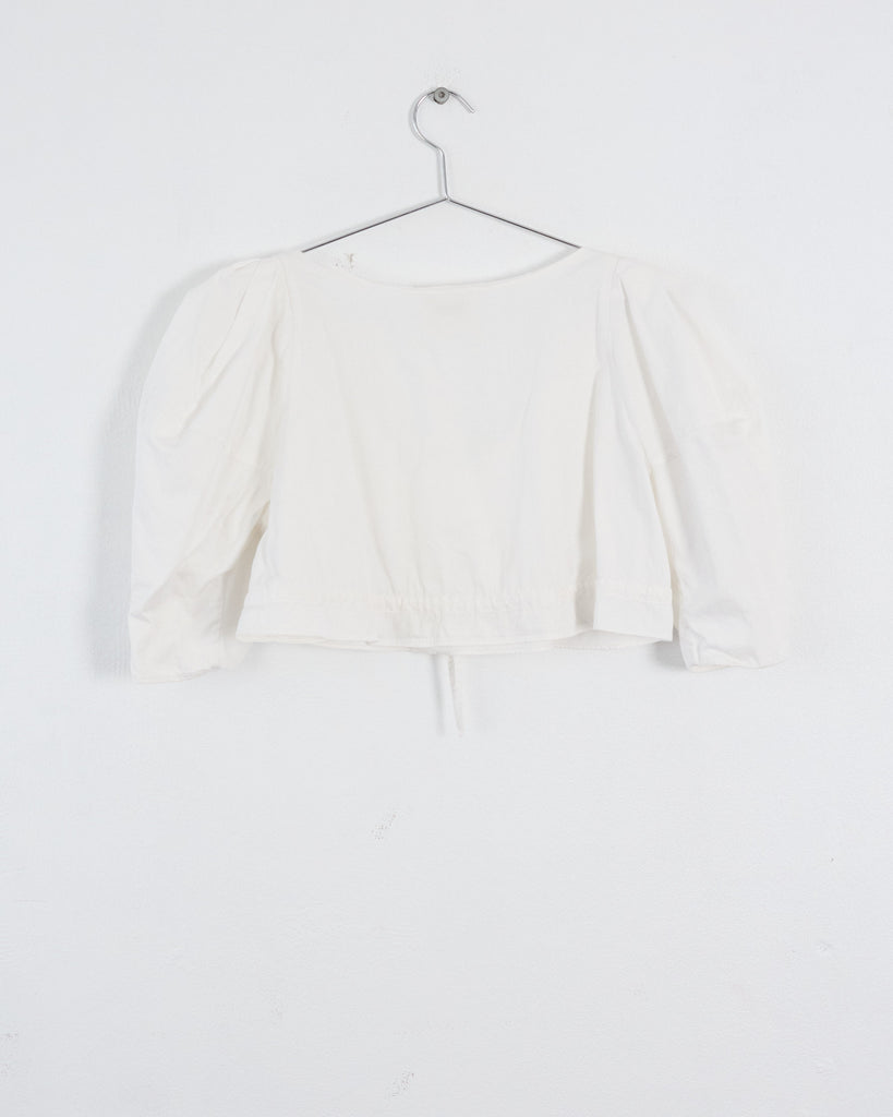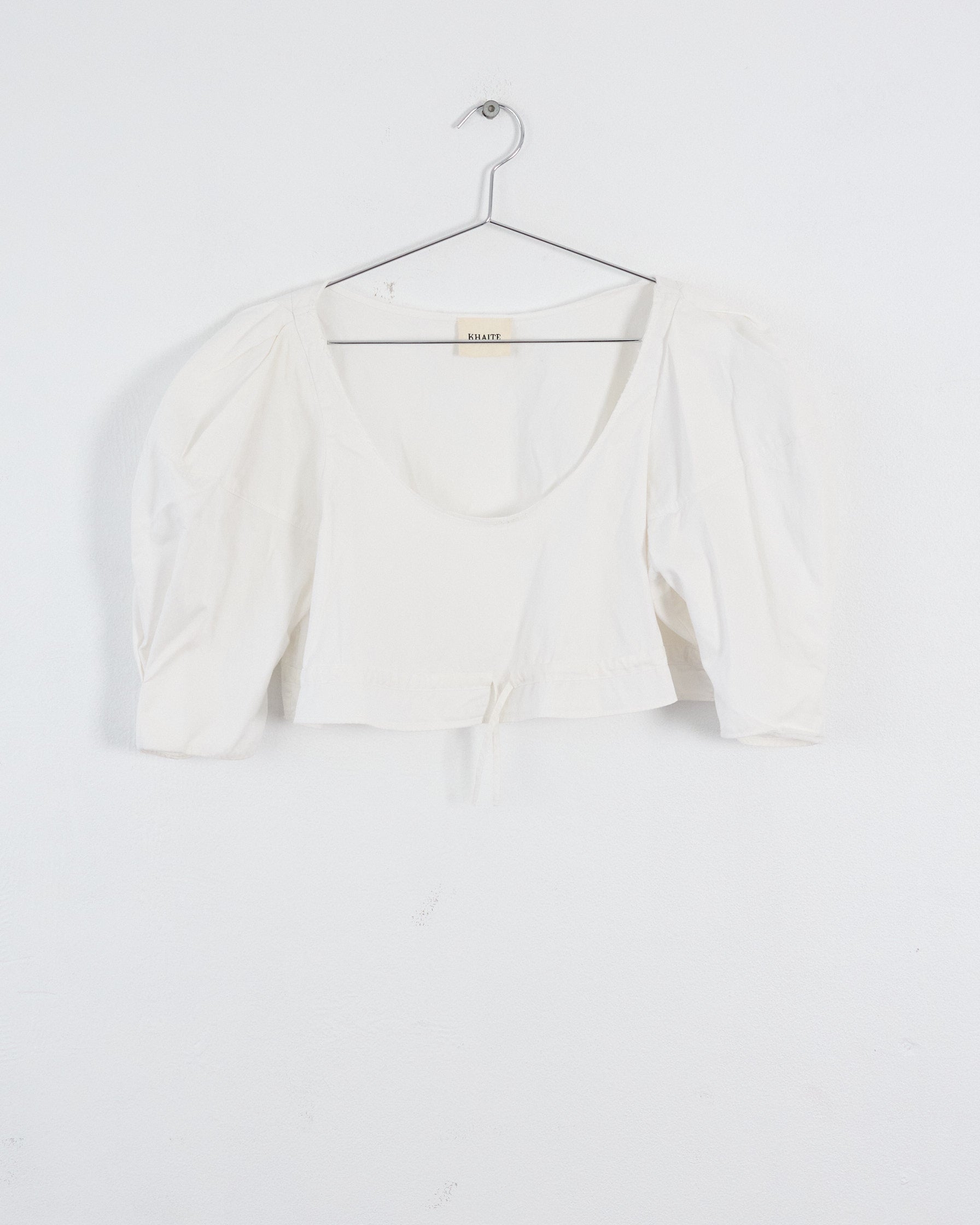 This white cotton poplin 'frankie' top by Khaite features a flattering scoop neckline which ruches at the bustline with a tie-fastening drawstring. Cropped under the bust, it has short artfully puffed sleeves and a playful ruffle trim at the hem.