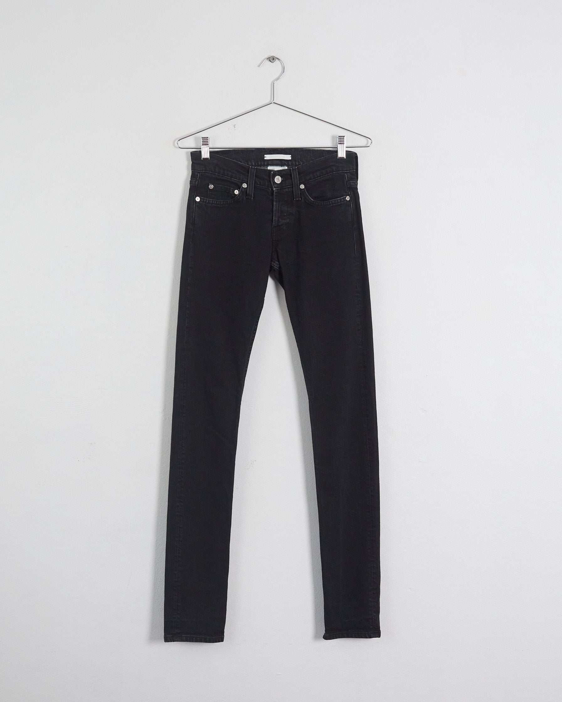 These Helmut Lang skinny jeans in washed black have a 90s appeal. A sexy low-waisted cut, they feature a concealed button fly with silver-tone button closure and classic five-pocket design with belt loops.