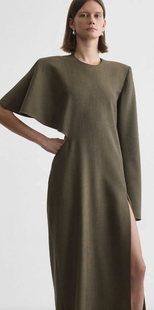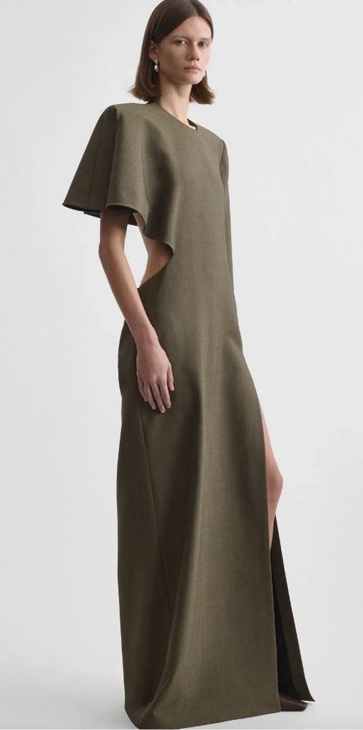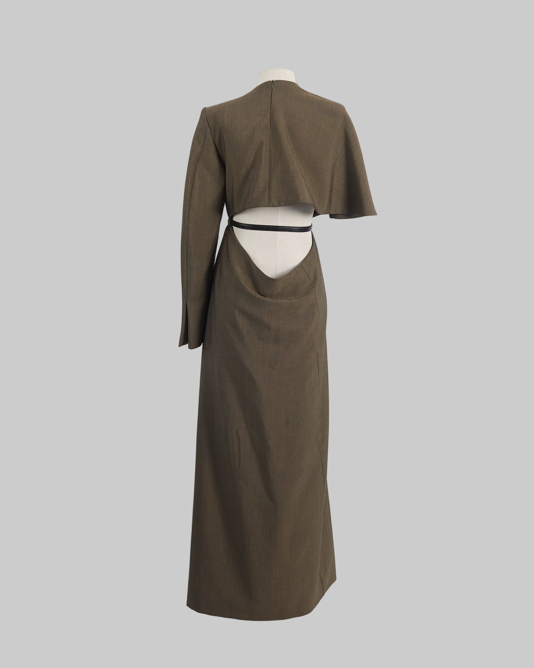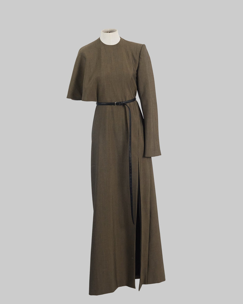 This striking maxi dress from Phoebe Philo's 2025 collection 'B' showcases architectural tailoring in rich tobacco melange wool. The asymmetrical silhouette pairs a structured long sleeve with a dramatic cape, while strategic cut-outs at the waist create visual intrigue. A high slit and back zip provide ease of movement, complemented by the included belt for styling versatility. A sophisticated statement piece, and a rare collectors item for the discerning wardrobe.