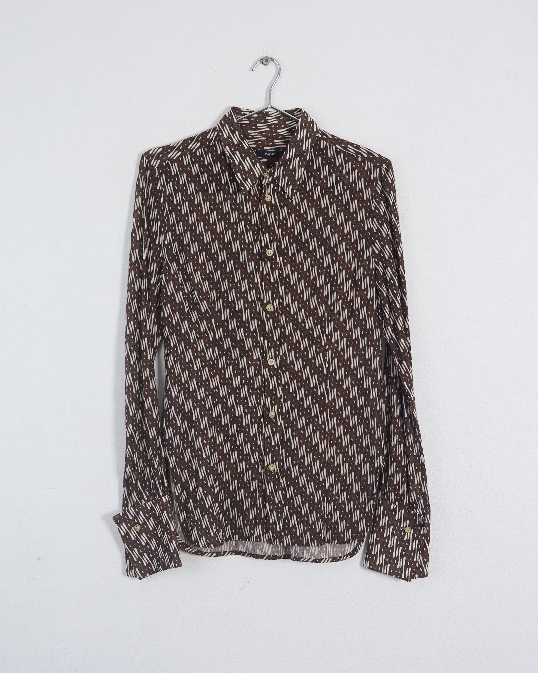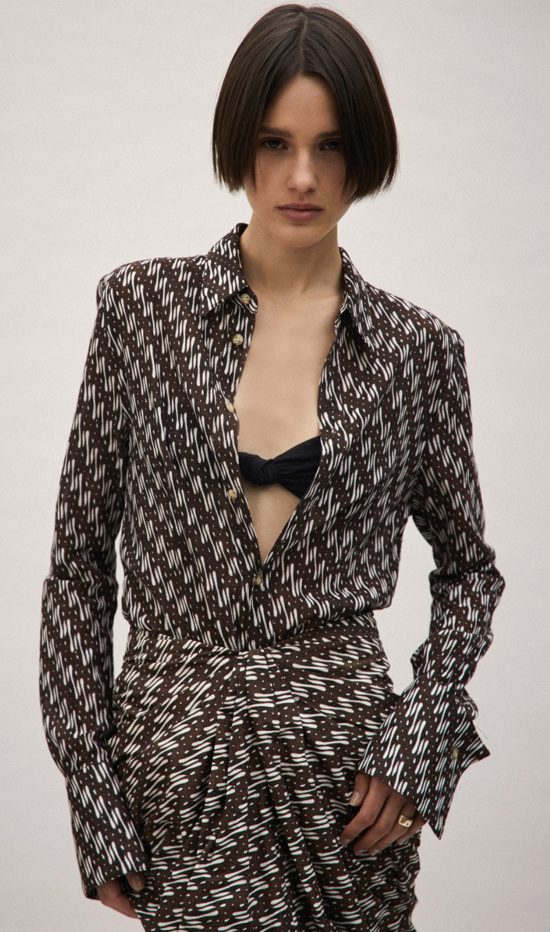 From Bassike's Resort 2021 collection, this button-front shirt features an organic batik print in brown and ecru. Designed with intentional proportions - structured deep cuffs with button closures, a gently curved hem punctuated by side splits - the relaxed silhouette and thoughtful construction make it a versatile foundation for a curated wardrobe.