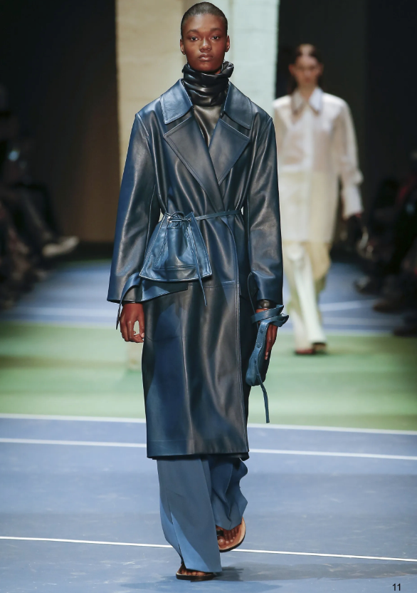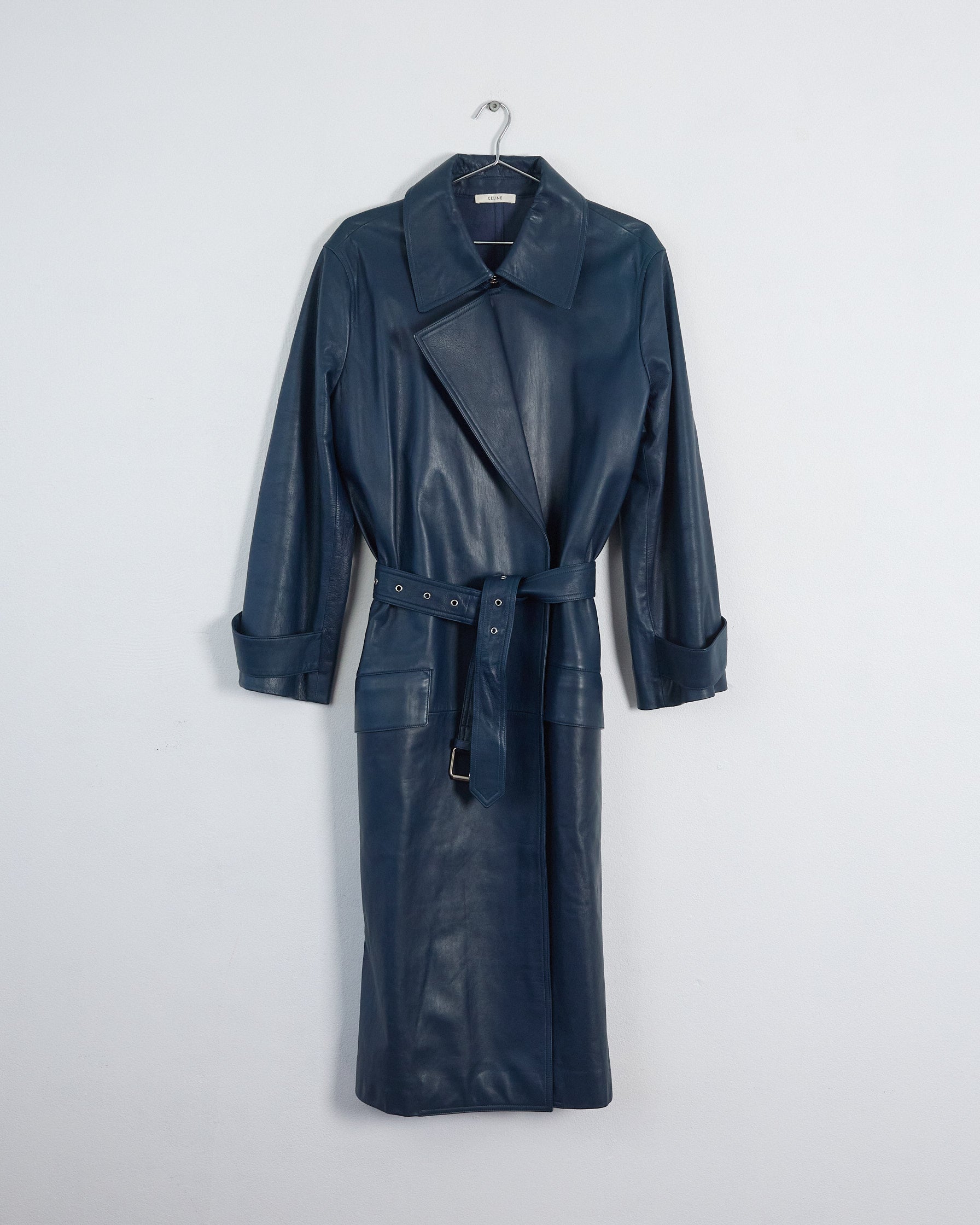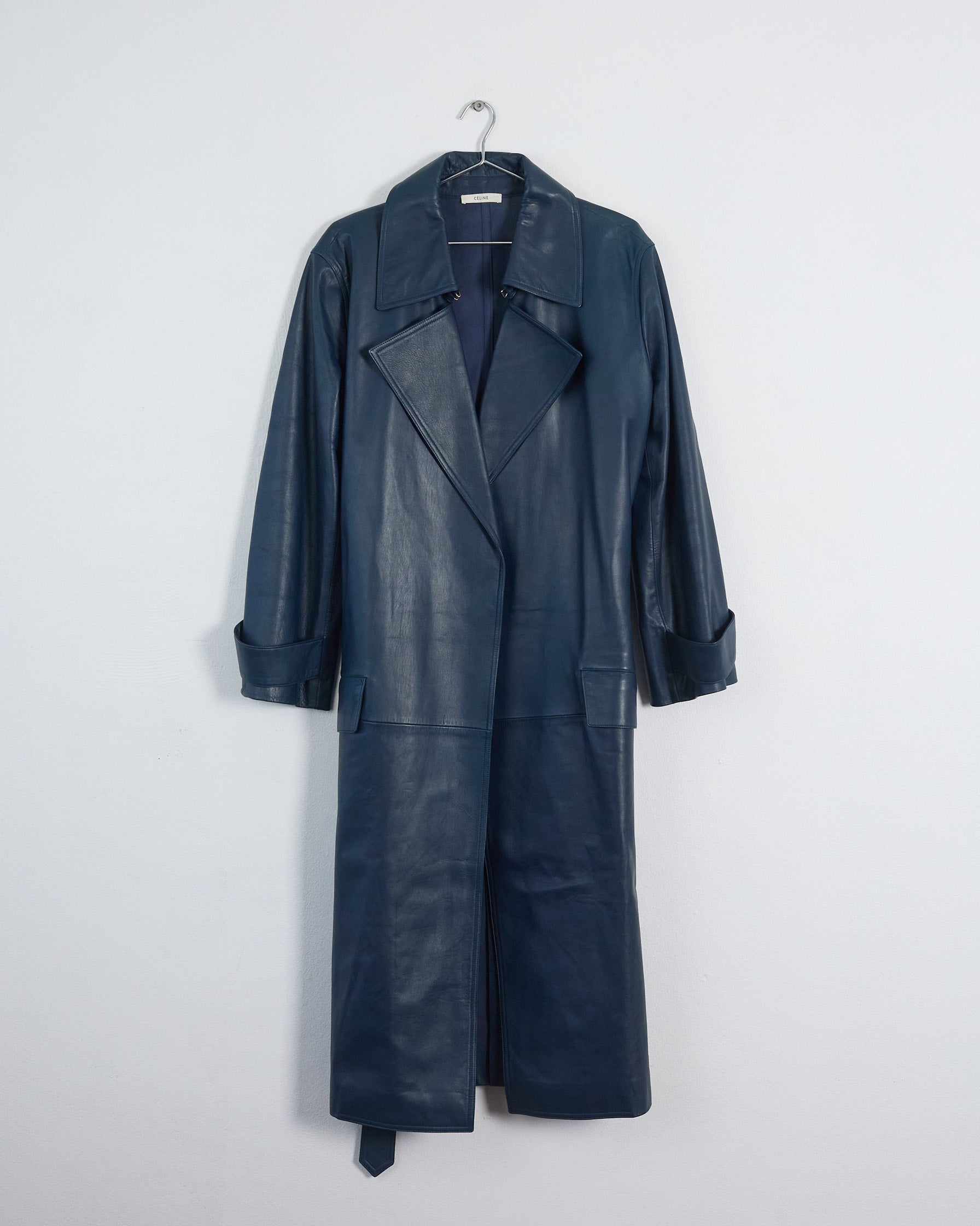 This iconic Céline trench from Phoebe Philo's Fall 2016 runway collection exemplifies understated luxury. Crafted from supple lambskin in a sophisticated slate-teal hue, the oversized silhouette features a relaxed notched lapel and rear vent for effortless movement. Signature details include dual flap pockets and a removable metallic eyelet utility belt with hook-and-buckle closure, offering versatile styling options. A timeless investment piece that transcends seasonal trends.