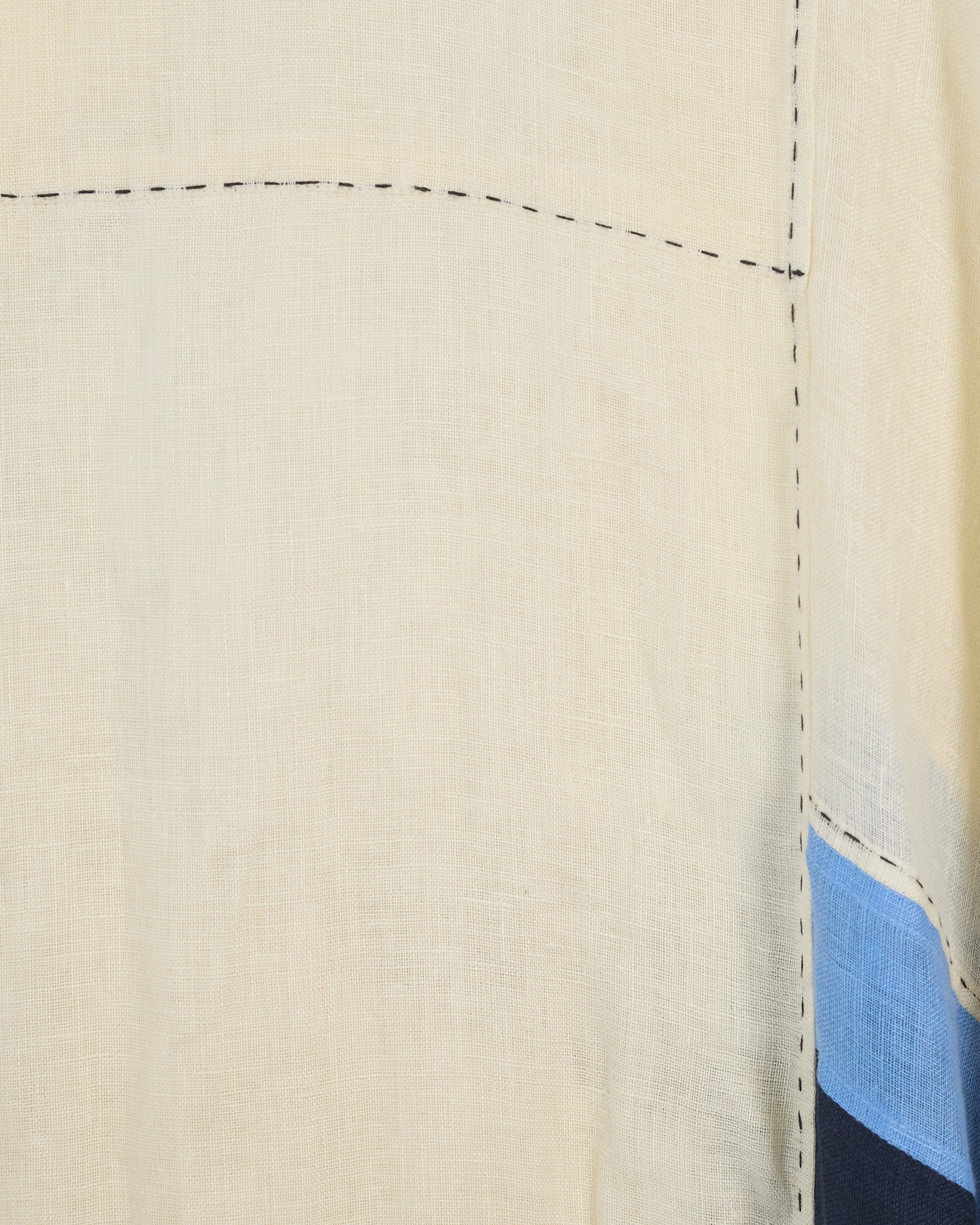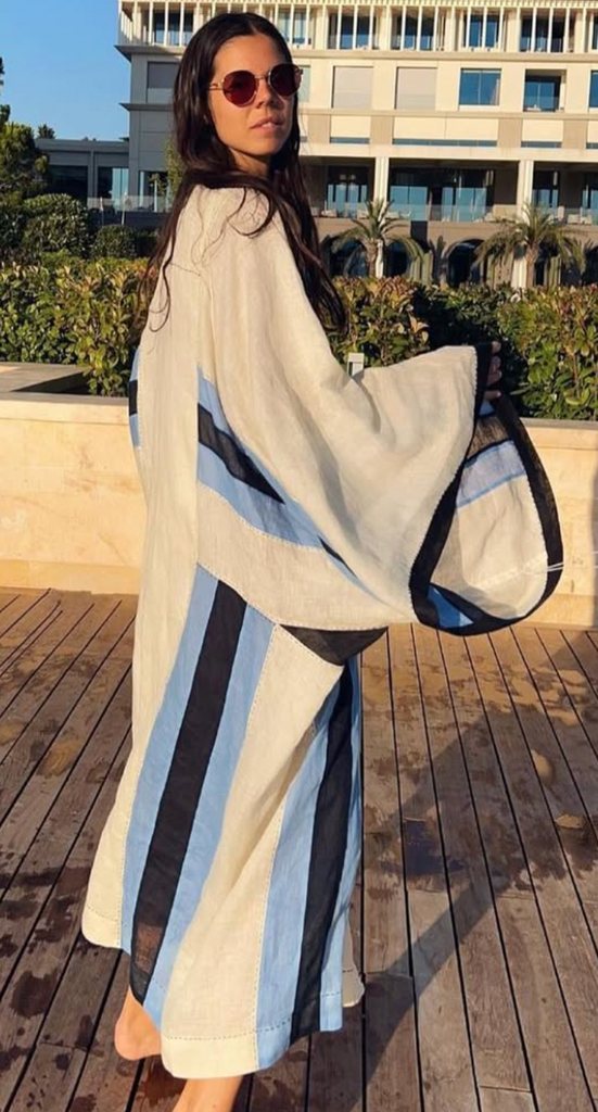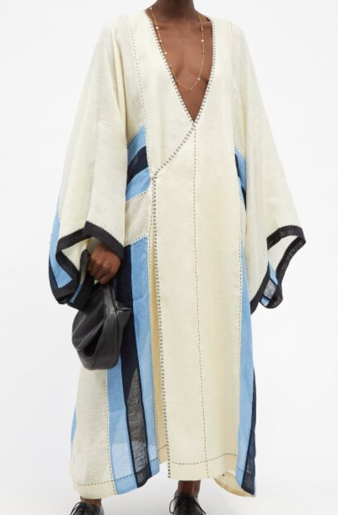 This oversized 'opium' linen wrap dress from Vita Kin combines wanderlust elegance with a relaxed silhouette. The plunging V-neckline and side-tie closure create a flattering drape, while panelled construction and drop shoulders enhance the fluid, vacation-ready aesthetic. Long, generously cut sleeves and the signature wrap front design offer versatile styling options. Crafted in breathable ivory linen with navy and blue stripe accents and contrast black stitch edging, this is an investment essential for the chicest of warm-weather wardrobes.