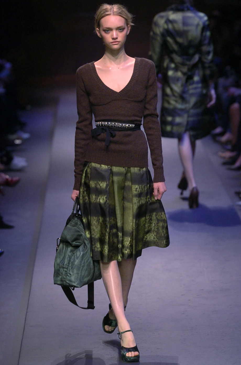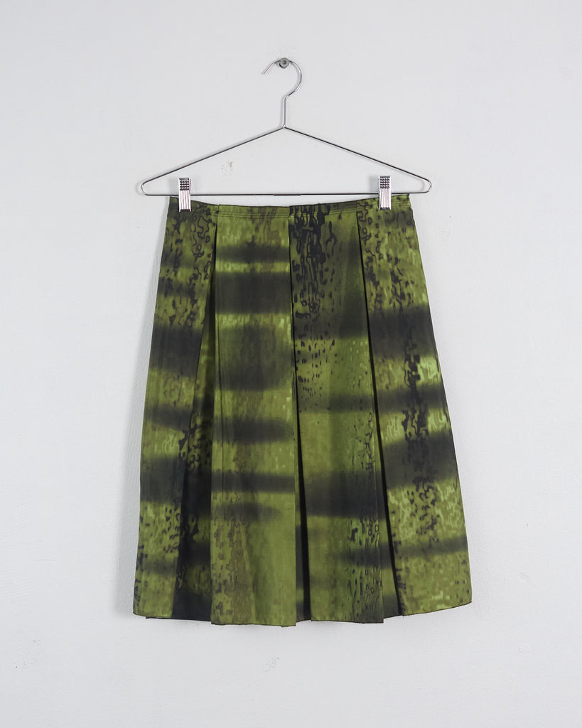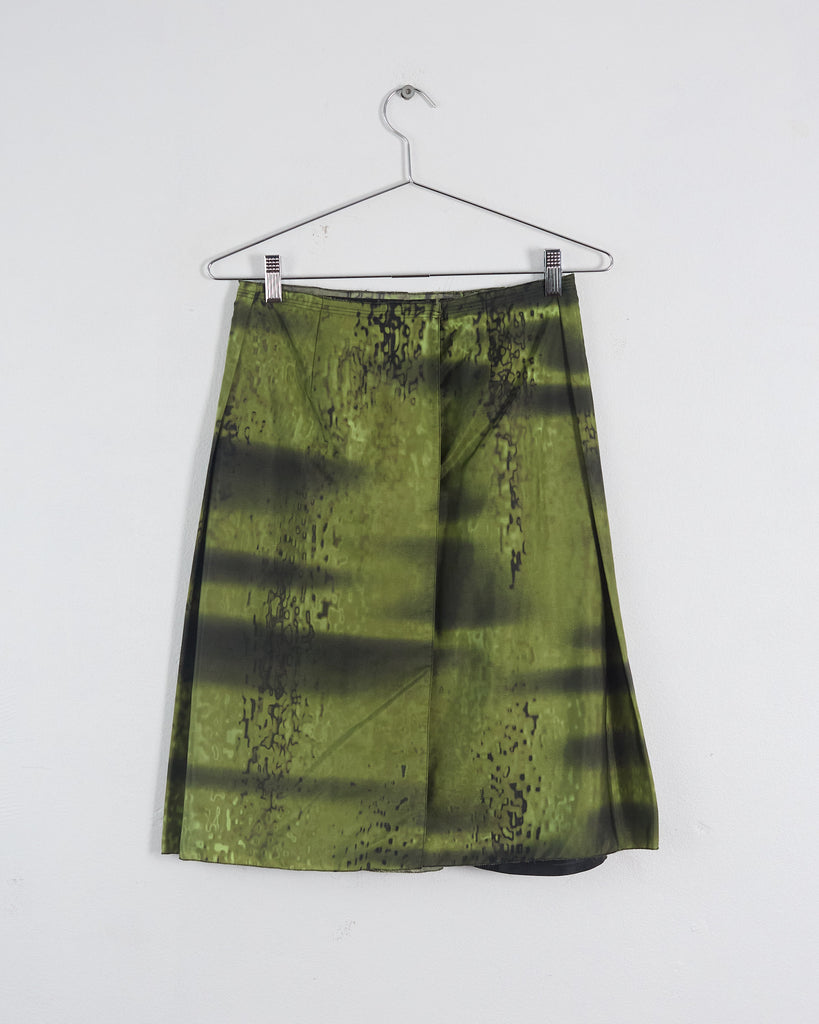 This iconic piece from the Fall 2004 runway at Prada – merging the aesthetic of eighteenth-century art with digital gaming culture. This midi-length box-pleated skirt features a green and black computer-generated print and is crafted from technical fabric that mimics the luxurious texture and sheen of silk. It includes a discreet double internal snap button closure for a refined finish.