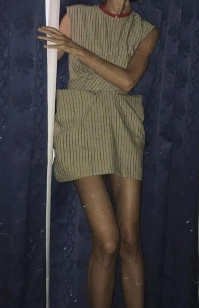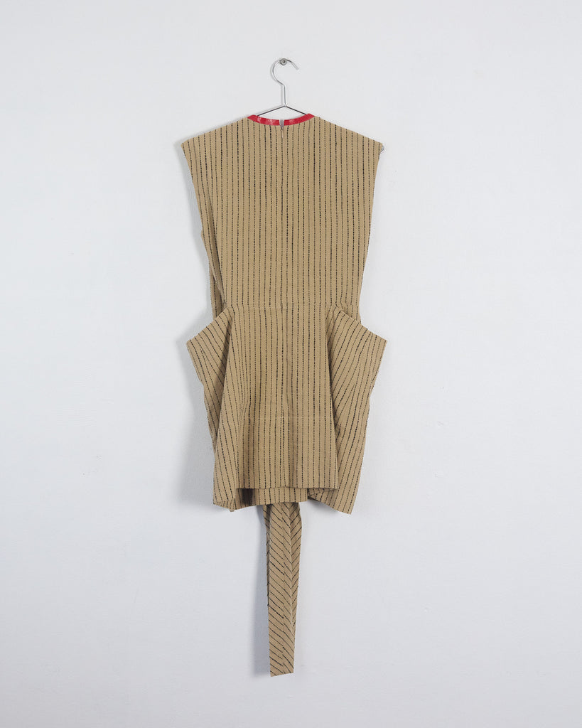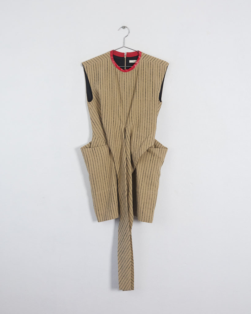 This exceptional Céline Pre-Fall 2017 piece exemplifies Phoebe Philo's aesthetic. Crafted from a luxurious linen blend, this sleeveless tunic features a beige base with black stitch stripes and a distinctive red leather neckline accent. The concealed back zip and dual front pockets offer practical elegance, while the extended wrap ties provide styling versatility - wear them loose and hanging or secure them at the back for a tailored silhouette. With the ability to wear as a longline top, tucked into a maxi skirt, or as a mini dress, this versatile piece comes partially cotton-lined for comfort - a rare collector's item to covet.