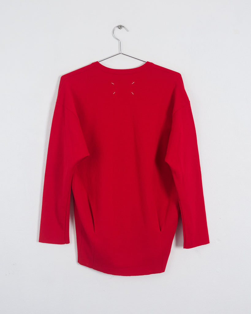 This Maison Margiela sweater showcases a striking deep V-neckline in a pop red, crafted from wool with an intentionally oversized fit. Ribbed detailing frames the neckline while long sleeves complete the contemporary silhouette.