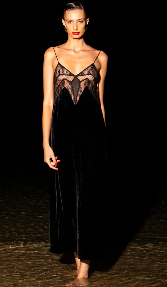 By Sleeping With Jacques, this 'francine' slip dress merges sumptuous velvet with intricate lace detailing across the bodice. The design showcases a dramatic low back and silk spaghetti straps that adjust to your frame.