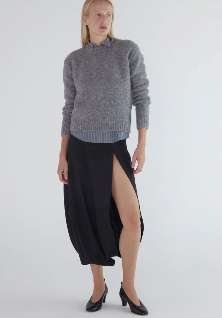 From Fall 2025, this 'mileto' skirt by Paloma Wool reimagines the midi silhouette with architectural precision. This black wool-blend piece features a distinctive asymmetrical design - one leg remains exposed while the other threads through a strategic opening, crafting an illusion of tailored trousers. Constructed from refined suiting fabric, it delivers drape and movement. A runway piece for the conceptual collector.