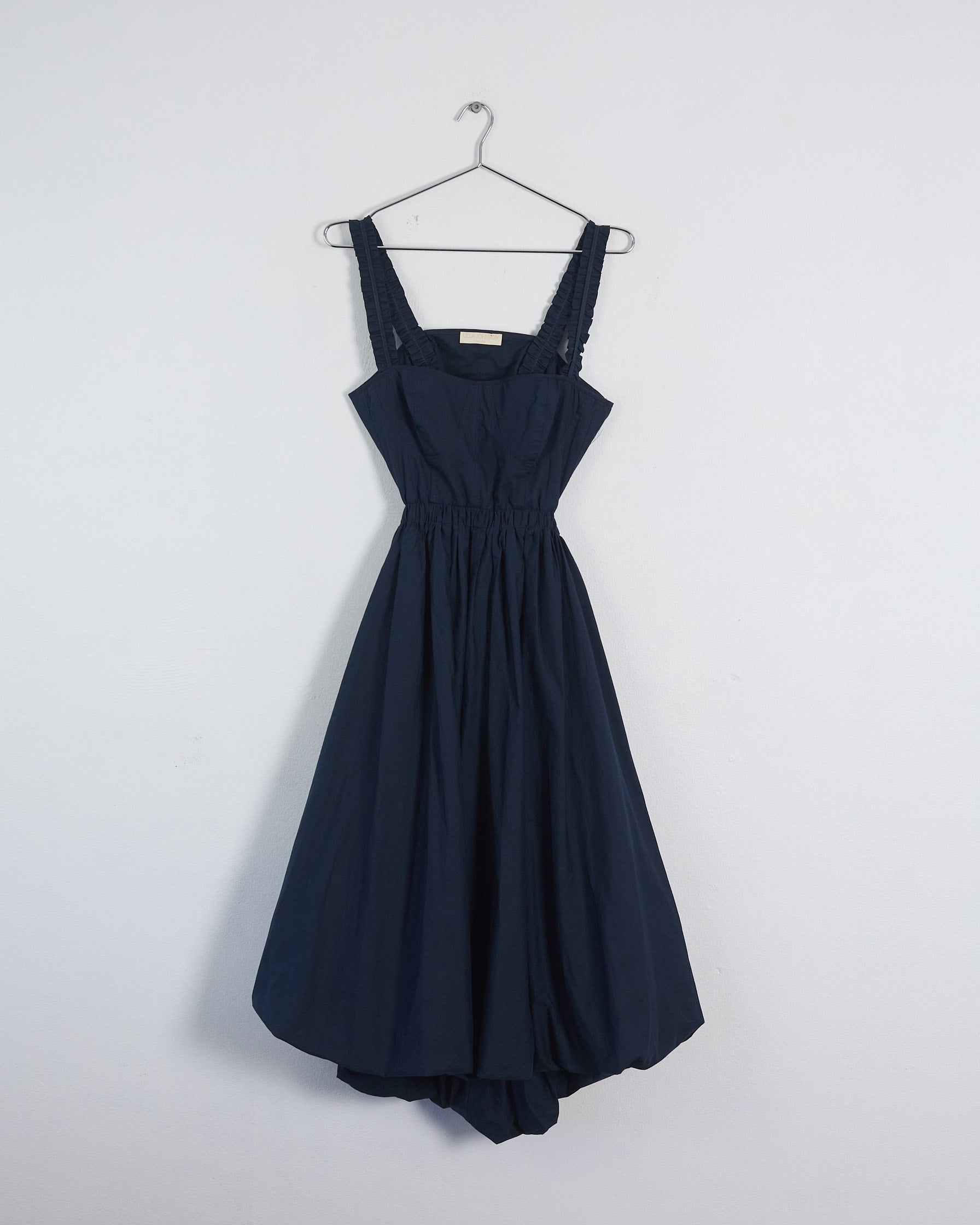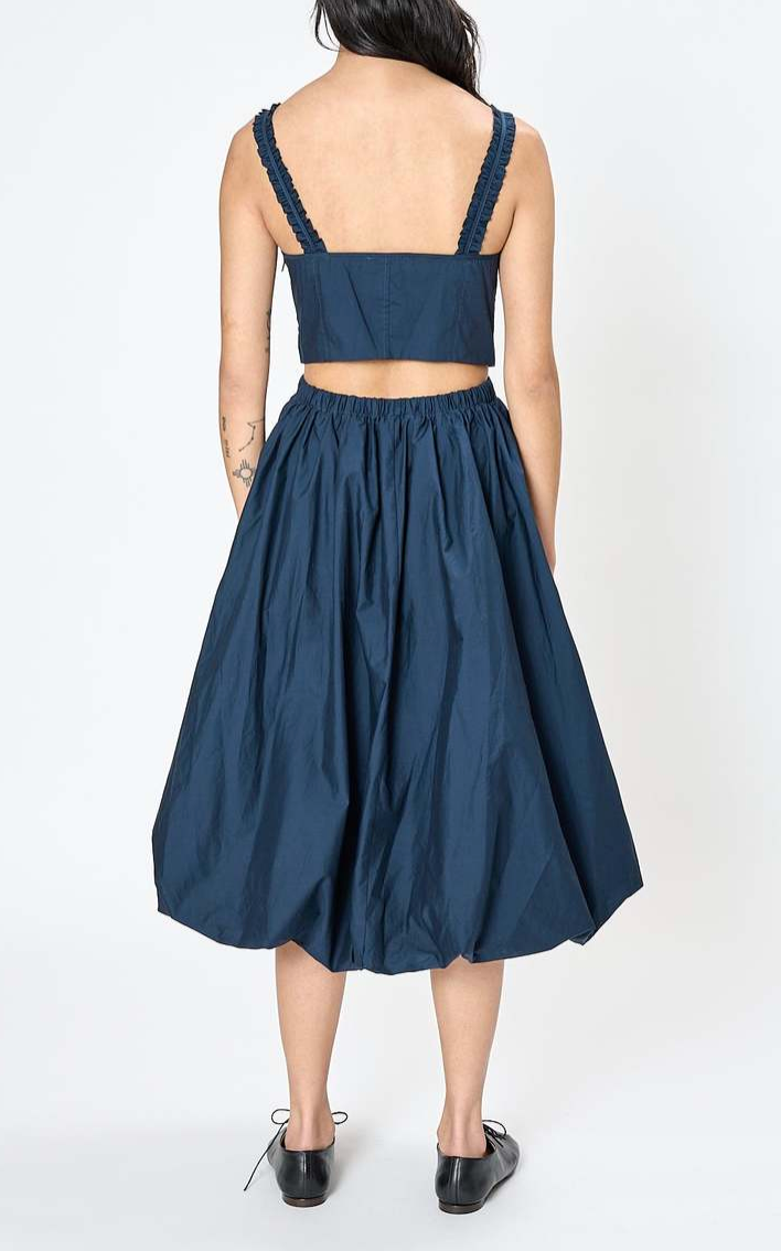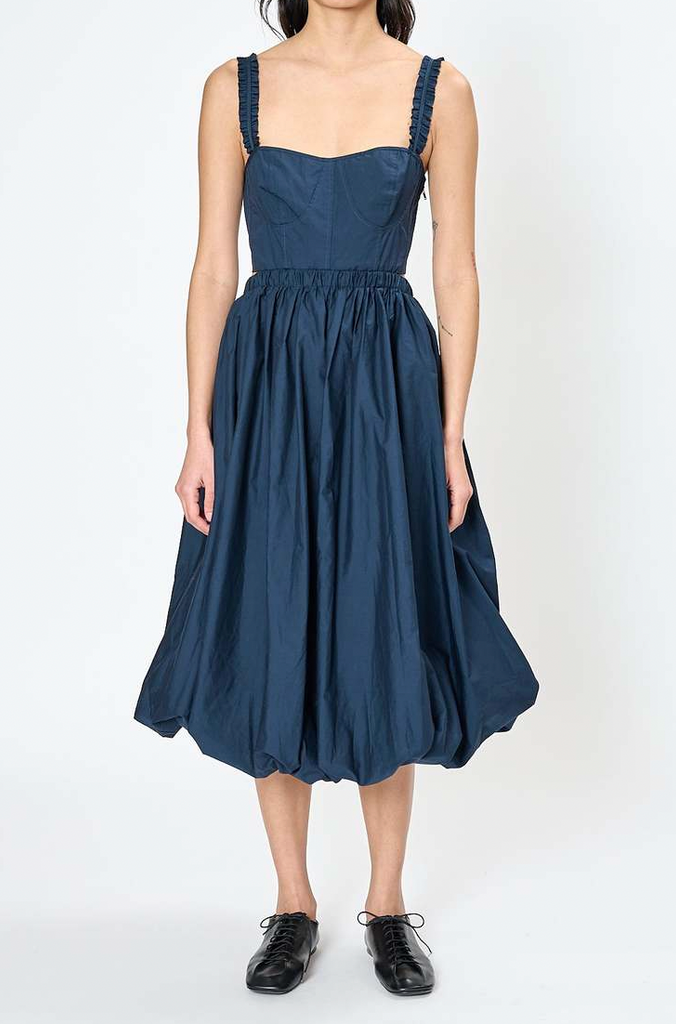This striking Ulla Johnson 'olympia' midi length dress pairs a structured corset bodice with dramatic skirt volume for an unforgettable silhouette. The fitted top features an exposed back and refined double-ruffled straps, while the cotton poplin skirt blooms into a signature bubble hem that grazes below the knee. A side zip closure secures the bodice, and functional side pockets offer practical elegance.
