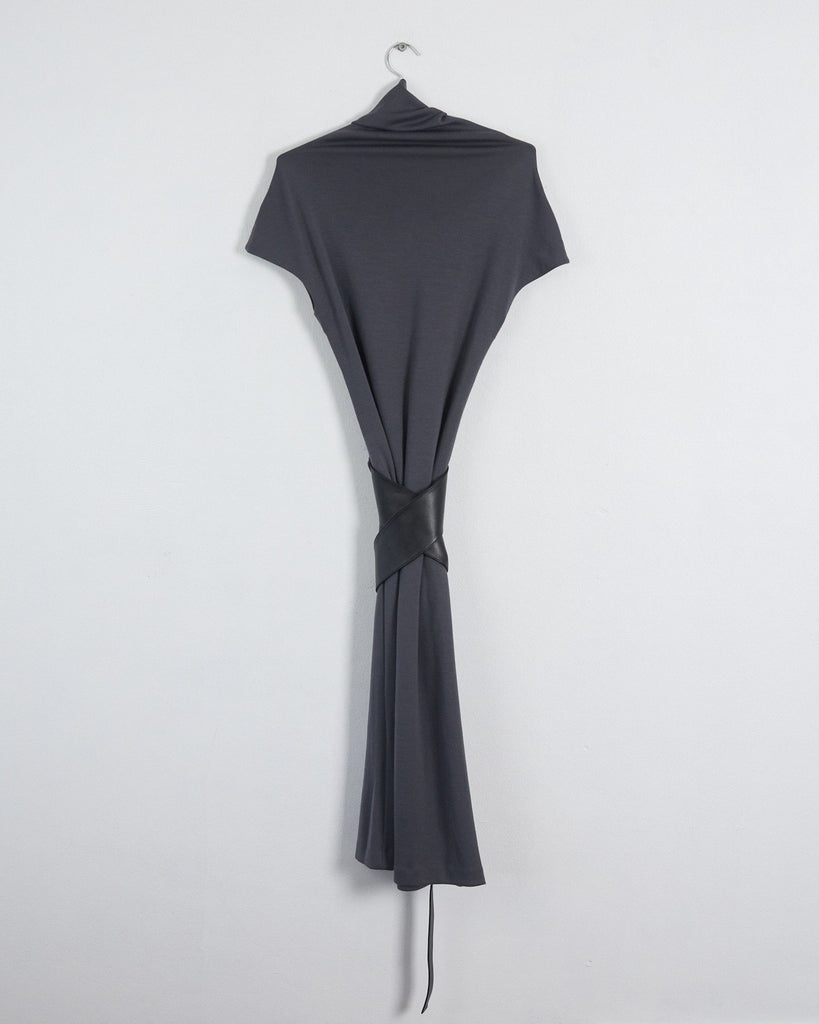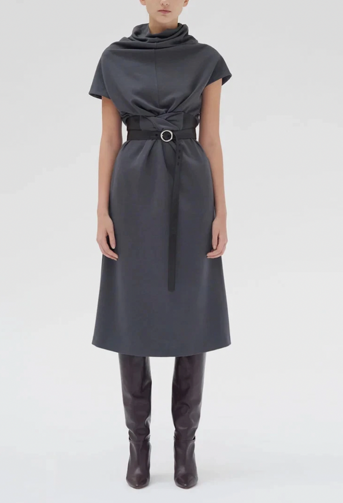 This grey wool dress, designed in 2018 by Phoebe Philo for Céline, features a cowl funnel neck and cap sleeves, falling to a sophisticated midi length. It is detailed with a fixed longline black leather belt accented by silver-tone hardware, which is designed to be worn wrapped around the dress.
