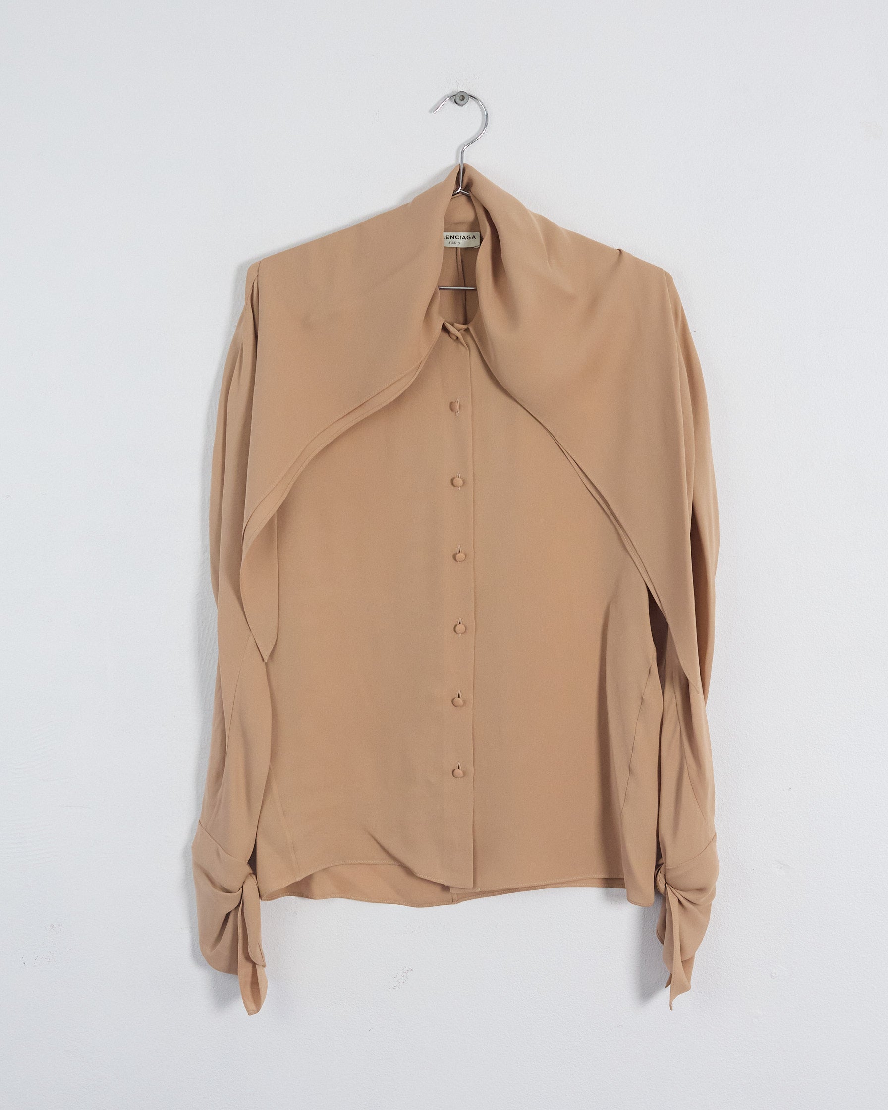 An exceptional piece from Demna Gvasalia's inaugural Pre-Fall 2016 Balenciaga collection, this blouse showcases refined craftsmanship in luxurious nude silk crepe de chine. The innovative shawl collar functions as a versatile neckwear element—wear it draped, open, or cinched as a necktie for multiple styling possibilities. Generous proportions with integrated side panels and a structured seamed back create architectural silhouette, while deep scarf cuffs add dramatic dimension. Finished with self-covered button closures.